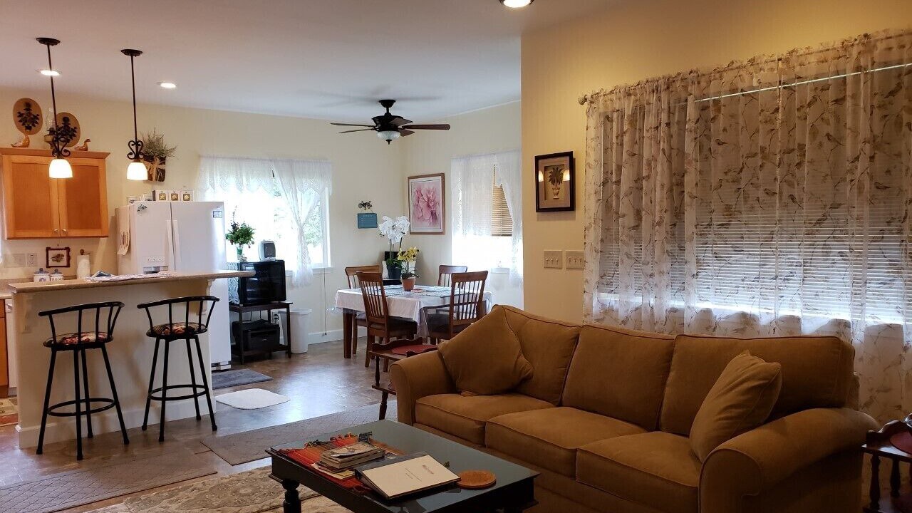 This peaceful country home is considered a " private residence" with a detached living area. It is located in a rural area away from tourism and off the beaten path. There are two separate structures situated in a way to provide privacy from one another. There is a main 1-bedroom house (this is the rental) and a smaller "cottage". We are located 1/2 way between Volcano National Park and Hilo; being 1296 sf under roof and a totally furnished 1 bedroom, 1 bath house on 2 acres. The relaxation experience is enhanced by a private 1-person whirlpool tub, quiet surroundings, and lots of songbirds. The bedroom has one queen size memory foam bed with and a walk-in closet. The living room has a sofa and a futon that will lay flat. The dining area consists of a 4-seat dining table and a kitchen bar. The bathroom has a walk-in shower and a whirlpool tub. There is a front porch for relaxing and listening to the birds. You will find this house very comfortable with all the amenities you need. Everything is included; all appliances; including washer / dryer, microwave, dishwasher, dishes, towels etc. Just bring your suitcase. There are many adventures to explore in East Hawaii such as Akaka Falls, Rainbow Falls, black and green sand beaches, tropical gardens, newly formed (2017 and 2018) lava fields and cones. It is a newer house and although this house is close to various vacation spots, it is off the beaten path located in a country atmosphere. The rate is very affordable, allowing you to stay just a little bit longer in Paradise. I hope that you will come relax and explore our beautiful Island. INTERNET** Internet usage is unlimited data but after using 100GB the speed slows down behind other users. If you need a lot of fast internet you would have to provide your own hotspot.