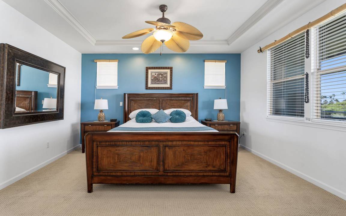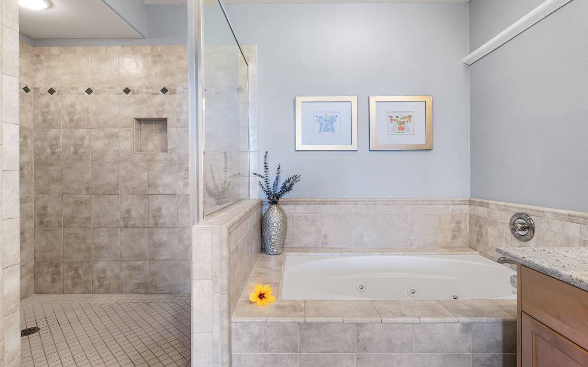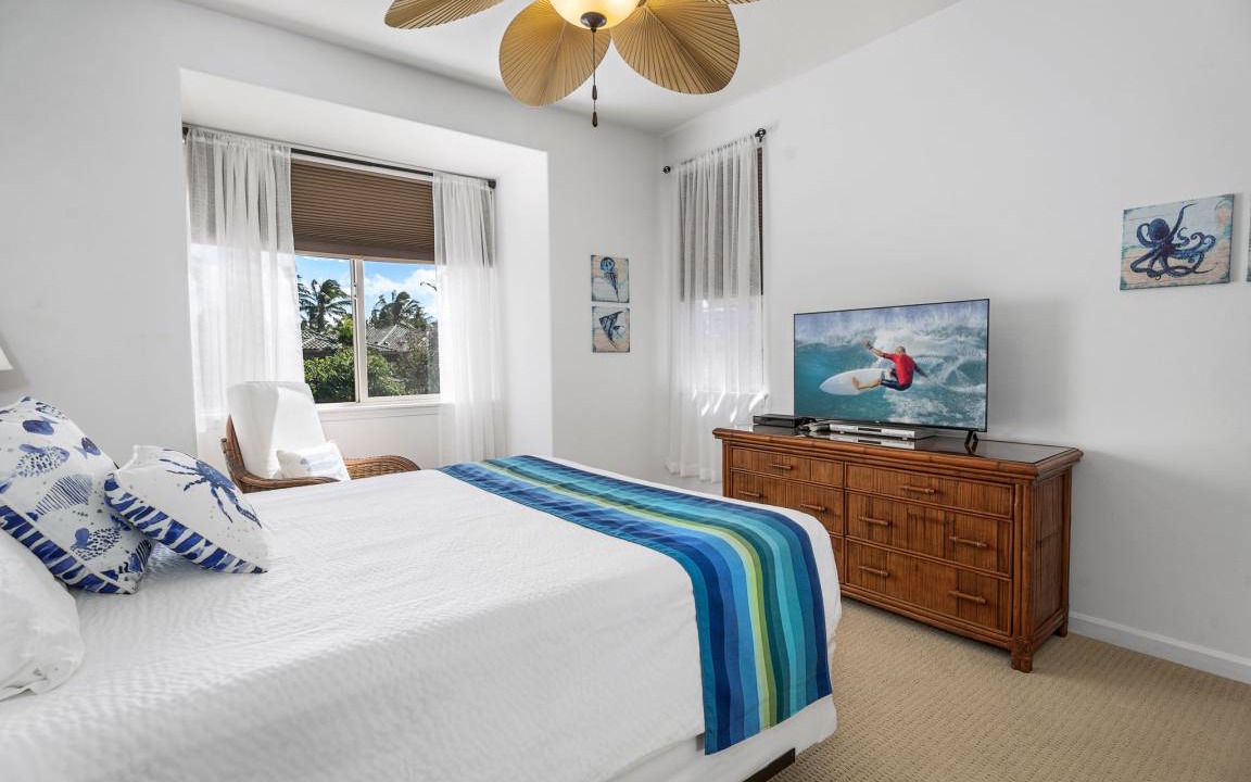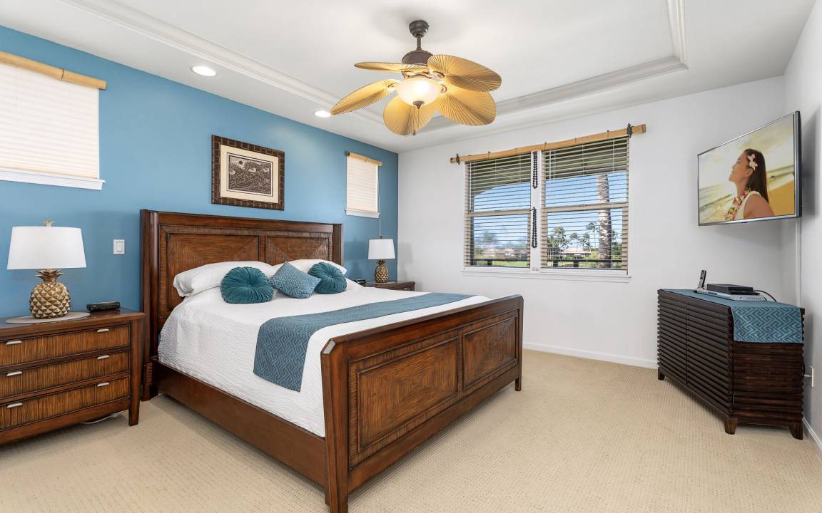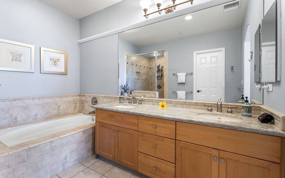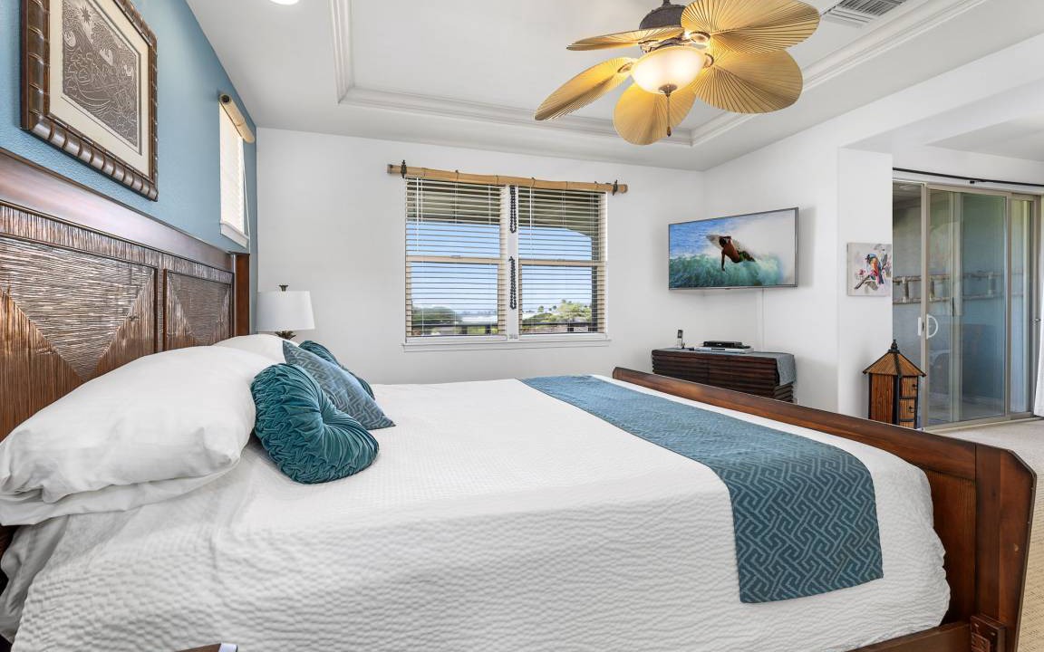 Primary Bedroom: Upstairs retreat with a Cal King bed, flat-screen TV, sitting area, and private lanai. Spa-like ensuite bathroom with double sinks, a large walk-in shower, and a soaking tub.