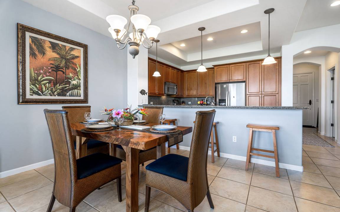 Living Area & Dining Areas: Comfortable and inviting with a 50-inch flat-screen TV, wireless DVD player, and comfortable, contemporary furnishing. Spacious dining room opening directly onto lower lanai is smartly outfitted with Tommy Bahama chairs and a live-edge dining table.