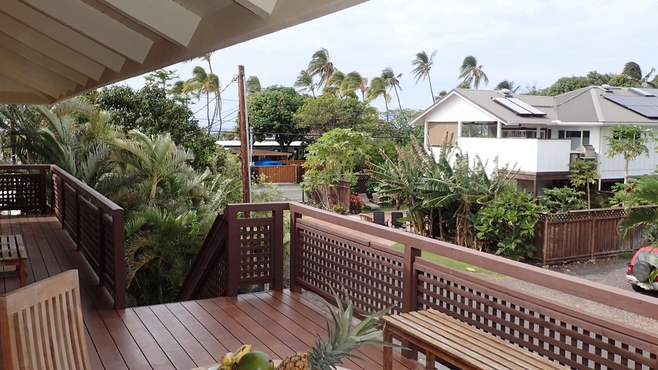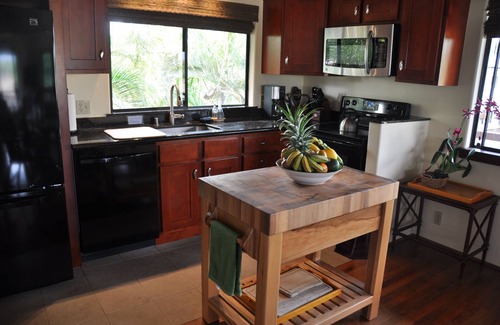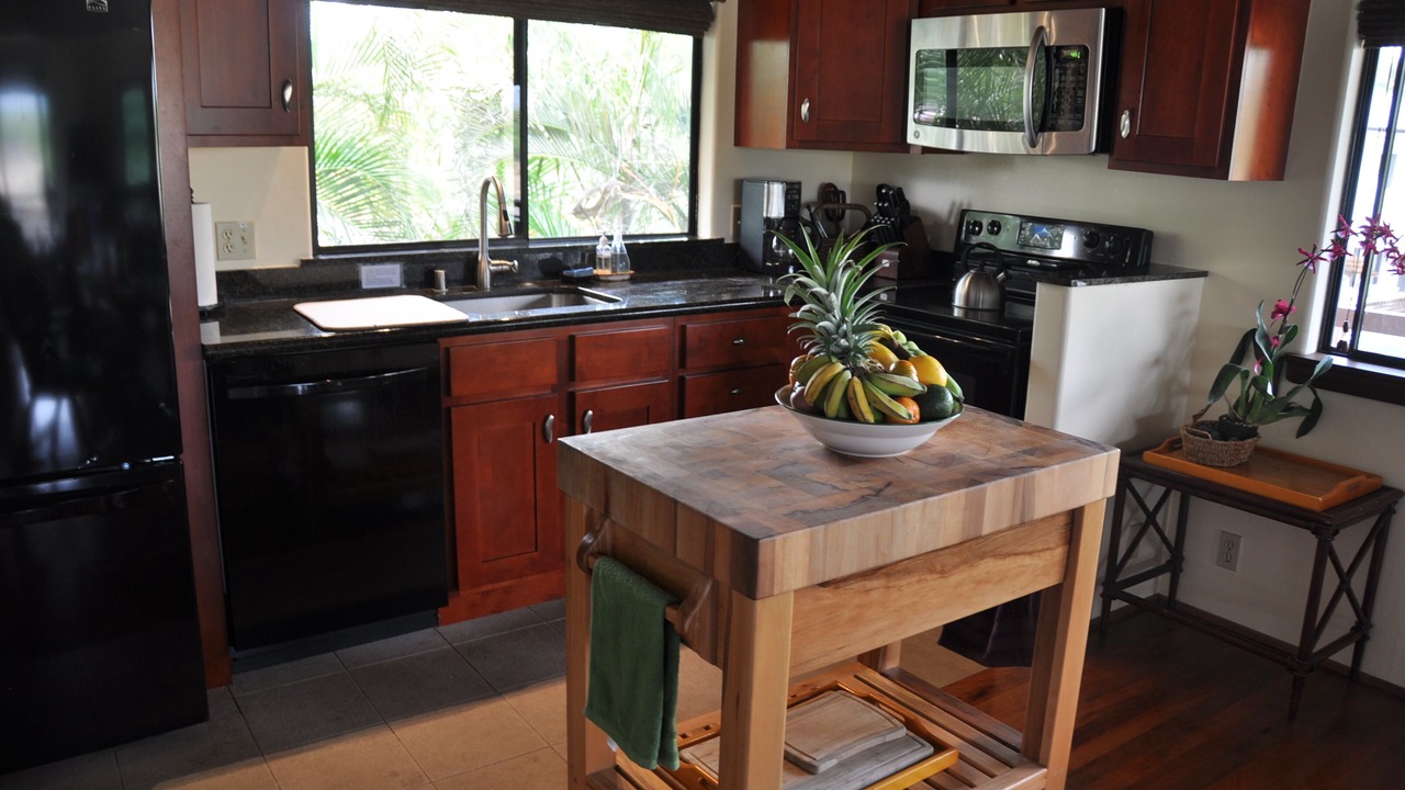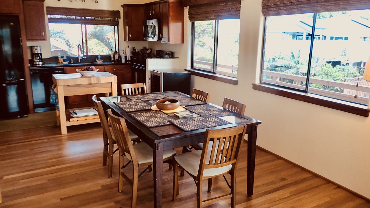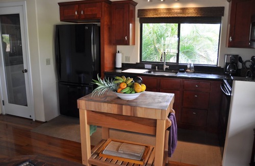 E 'Aka 'Aka Mau House is uniquely set up to accommodate family and friends, but still afford privacy. The upstairs area is air conditioned for warmer days and has a spacious living room; the cathedral ceiling with two fans gives the space a light, airy feel. This same ambience carries over to the dining area, where koa trimmed windows and wooden floors show off the 'Hawaiian plantation' decor of the room. Open the large sliding glass doors and windows to allow in the breeze! The galley kitchen is well equipped with everything necessary to prepare any kind of meal, from a Thanksgiving turkey to Hawaiian and Asian fare. Granite-topped counters, hard-wood kitchen island, and a large, shelved pantry provide the ideal space to create meals for family and friends. And a Weber Spirit II propane grill is readily accessible on the deck, perfect for grilling that special Hawaiian dish!