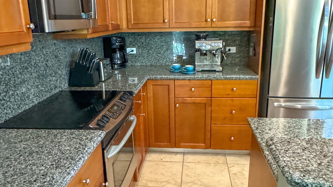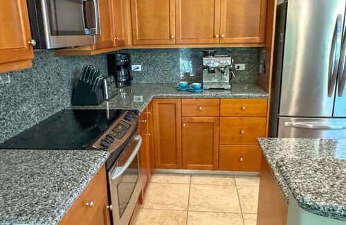 The well-appointed kitchen will please any holiday chef. It even includes an Breville espresso machine so you can make your personalized coffee. A drip machine and french press are also available.. Our private lanai/porch is lovely for an evening meal prepared on your own Viking propane BBQ and outdoor prep centre. For your media needs, the unit includes 3 flat screen TV’s with cable, smart TV, wireless/MP3/iPod stereo system and wireless internet. There is also a new full size washer and dryer for your convenience and hanging rack for drying.