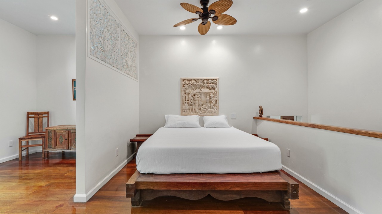 The living space is open and breezy, offering a dining table for shared meals and a living room with a TV for your evening entertainment. When it's time to turn in for the night, head upstairs to find a lofty bedroom with a TV, an en suite bathroom, and doors that slide open to a deck overlooking the palms.