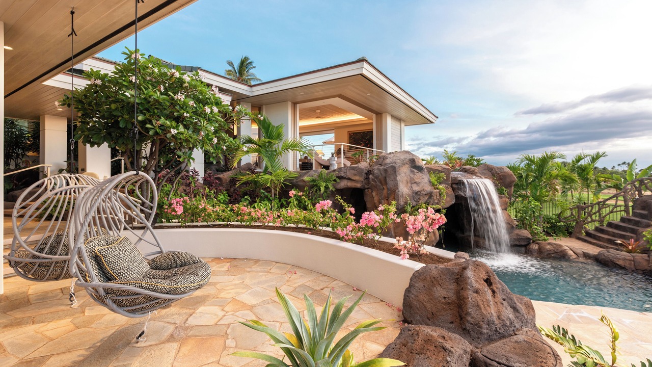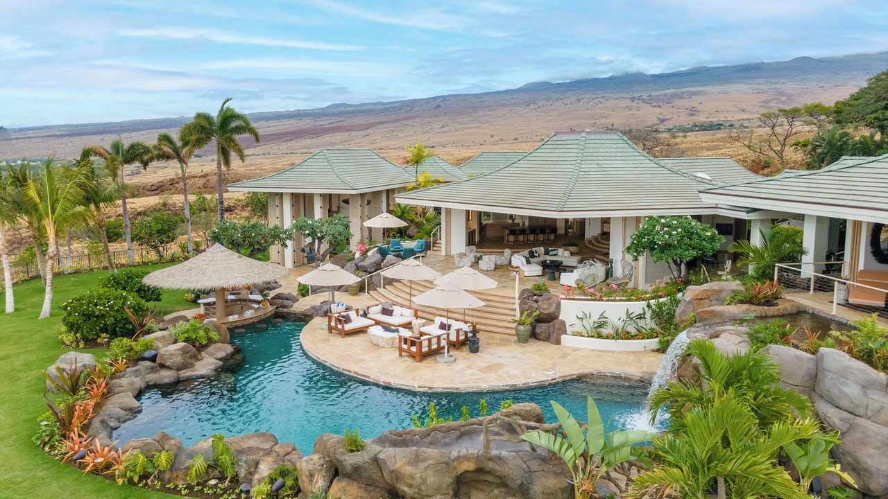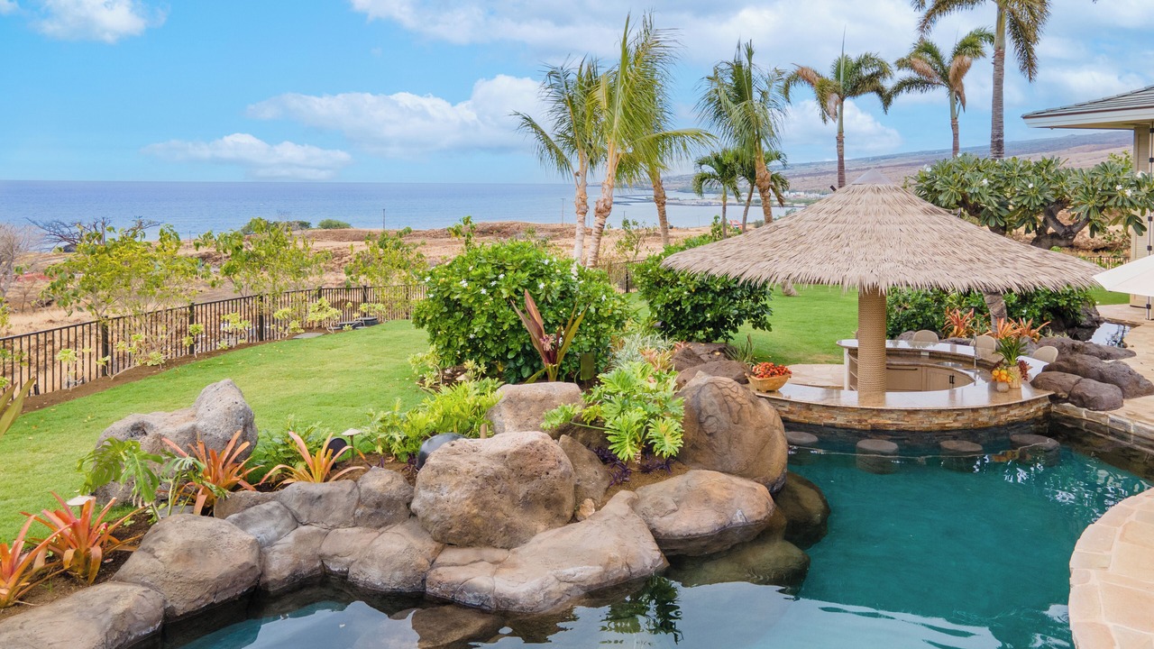 Surrounded by lush tropical greenery, the villa offers seamless indoor-outdoor living. Highlights include a pool, palapa bar, and waterfall grotto spa, all within vibrant, flowering landscapes. As an added benefit, you will enjoy the blissful Hapuna and Mauna Kea waters for ocean dips and activities including surfing, body boarding, SUP, snorkeling, whale watching, and so much more.