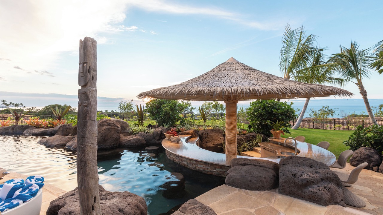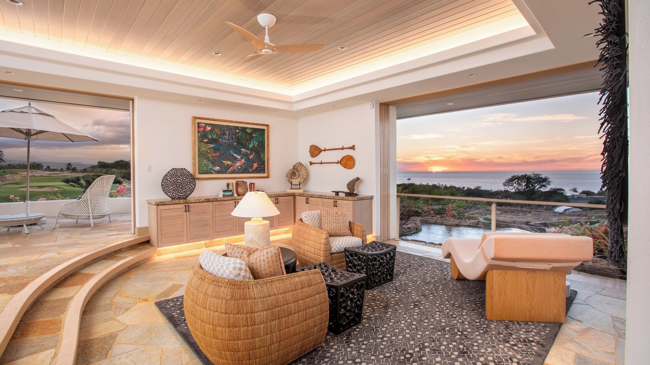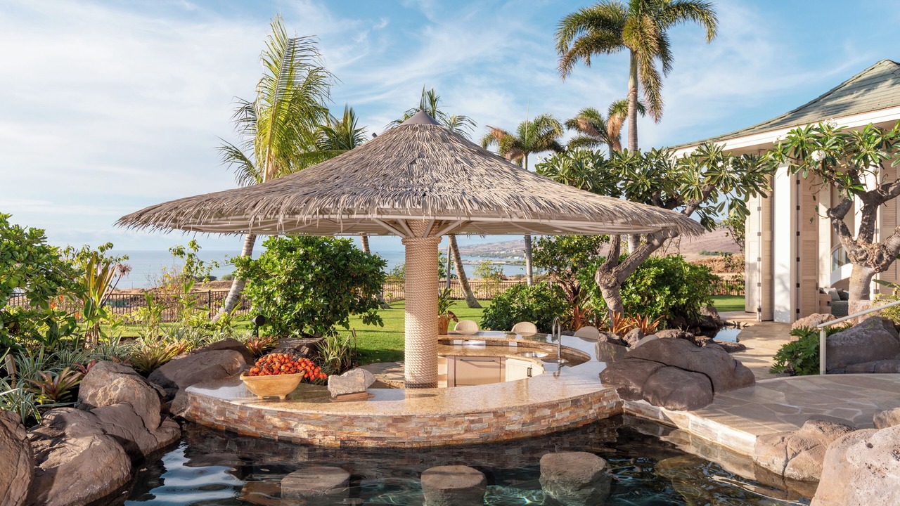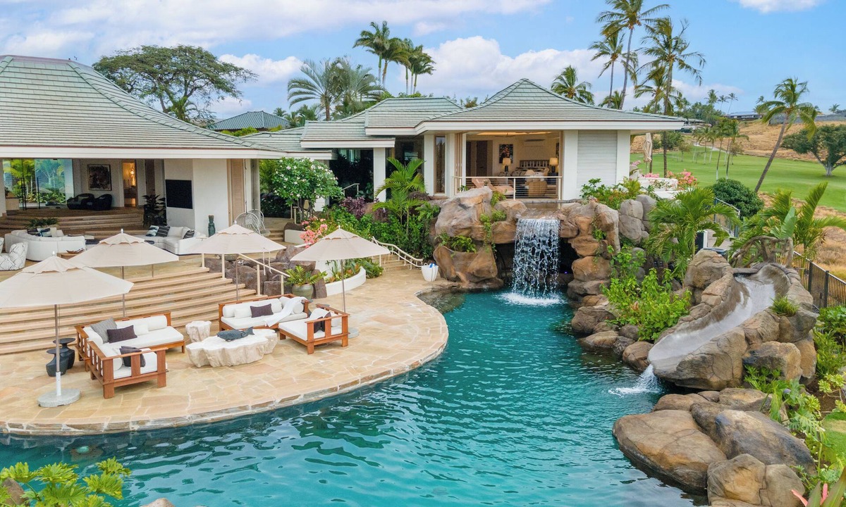 Surrounded by lush tropical greenery, the villa offers seamless indoor-outdoor living. Highlights include a pool, palapa bar, and waterfall grotto spa, all within vibrant, flowering landscapes. As an added benefit, you will enjoy the blissful Hapuna and Mauna Kea waters for ocean dips and activities including surfing, body boarding, SUP, snorkeling, whale watching, and so much more.