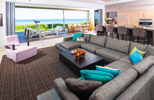 Best Location on the beach! This beautiful contemporary beachfront home is in a prestigious gated community on one of the best beaches on the North Shore. . Our beach is great for snorkeling when the seas are calm and surfing when the surf is up. We are minutes away to the best beaches on the the island. There is a wonderful shady biking trail close to the home and we provide bikes and helmets for four guests. This impressive home sits on a perfect lot with full ocean and coastline views. Thirty-five foot sliding glass walls open the great room to a beautiful large covered deck with incredible views. The deck is furnished with a dining table with seating for 6, Hot Springs Spa for 6, sofa, two comfortable oversized chairs, chaise lounges and BBQ Grill with 5 burners. We provide beach towels and beach chairs. The home has four bedrooms and an office that can convert to a bedroom with queen size bed. There is a large eighty inchTV in the great room and large 75" TV's in Master Bedroom and 50" TV in the office. The Upstairs Master Bedroom has a Brand New Color Laser Projection TV System.