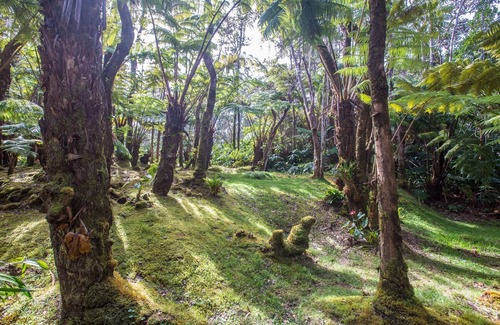 Hale Mauna Loa offers the complete Hawaiian volcano experience. The home is tucked cozily in a very private corner of lush tropical rainforest in Mauna Loa Estates. Located just a minute from the quaint selection of restaurants and stores of Volcano Village, and just a four-minute drive from Volcanoes National Park, Hale Mauna Loa offers the perfect balance between a relaxing getaway and home base for your adventures.