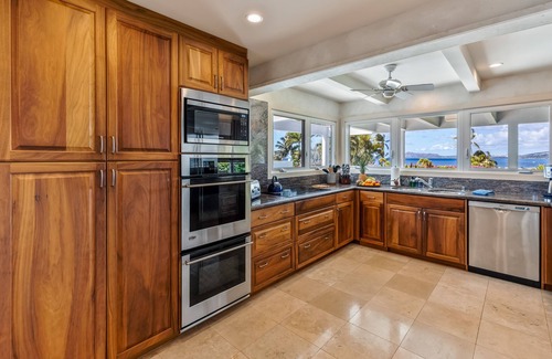 Recently upgraded with custom koa wood cabinets, granite counters, and stainless steel appliances, the kitchen is stocked for culinary creativity. Dual ovens, multiple refrigerators, and a lanai beverage cooler make it easy to cook, entertain, and gather.