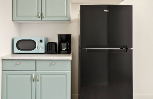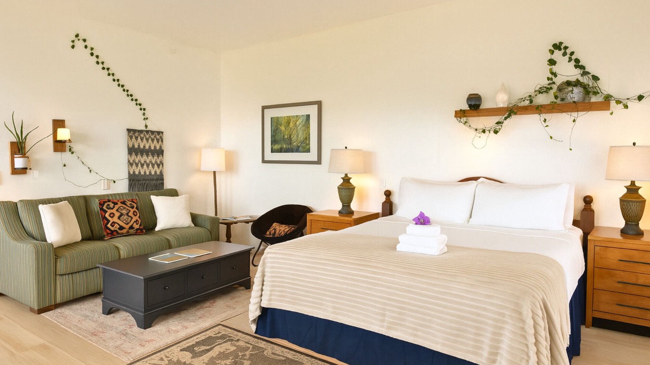 The main room has a Cal King sized bed and a cozy little sitting space that faces the ocean so you can enjoy ocean views from your bed or couch.