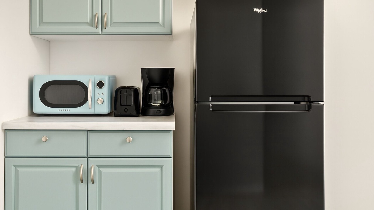 The kitchen is fully equipped for enjoying home cooked meals. There's a fridge, microwave & a coffee machine as well.
