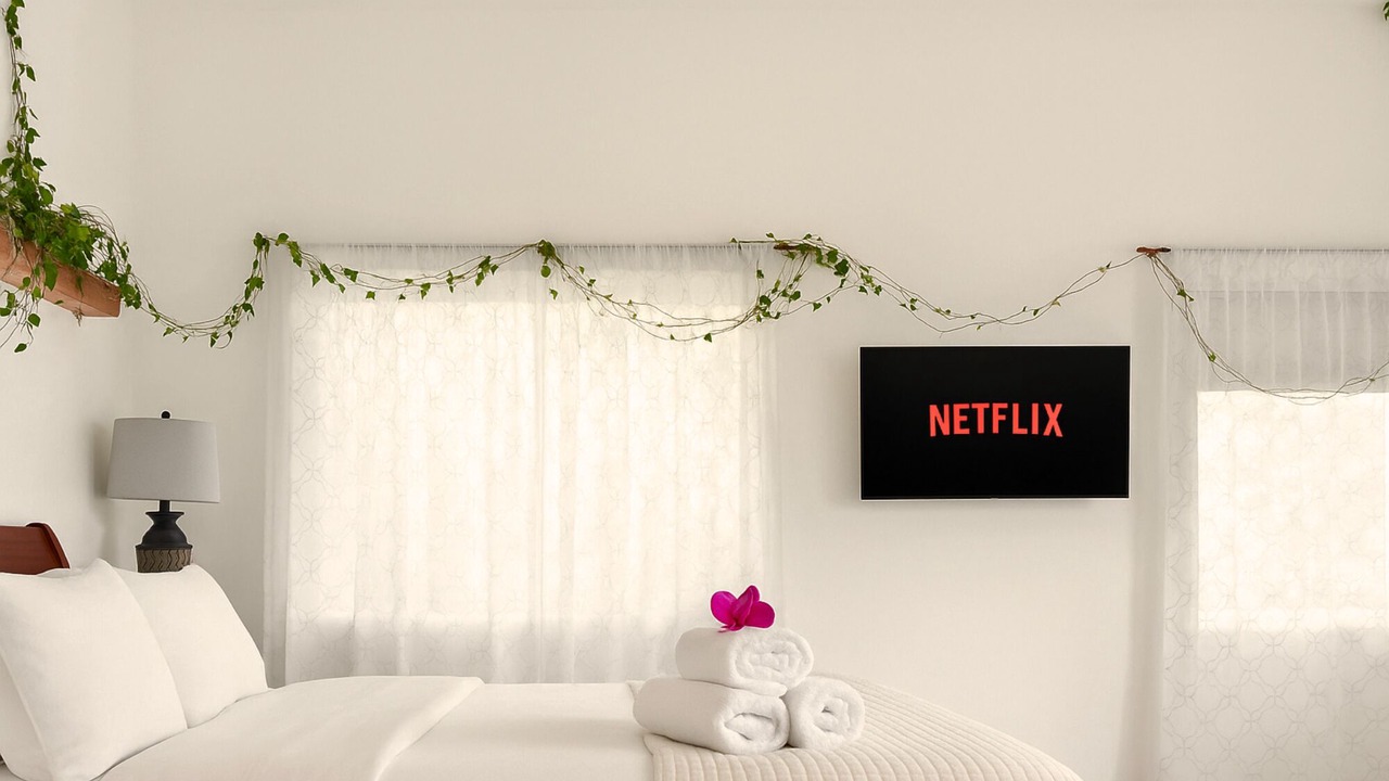 The couch also turns into a queen sized bed if needed. The TV has Roku and you can log into tv and watch TV on days you'd like to take it slow.