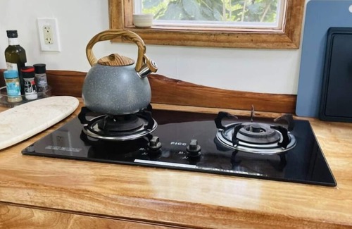 This beautiful, 800 sq. ft. Luxury, off grid, coastal cottage is located in the lush jungle of the East side on the Big Island of Hawaii. Quiet and private it is surrounded by wildlife. Hear and see the ocean waves. This custom-built, artistic home displays masterful local woodwork and has beautiful jungle, garden, and ocean views. Located near the ocean and very private, this cottage is completely off-grid, on solar power and deep well water. Reliable Starlink provides fast WiFi for streaming or working. There are tidal pools known for snorkeling and great cliffside fishing spots within walking distance. Downstairs is Outfitted with an efficient kitchen, full size pull out sofa, washing machine and custom coral walk in shower. Leading up the stairs you will find a comfortable king size bed awaiting your arrival. Closet and half bath are also found up the stairs. Private second story lanai with sliding glass door leads to a serene hammock with coastal jungle views. Guests are in for a treat when they experience the view from the private roof top deck! Hear the ocean crashing or even hear the whales from bed during whale season, star gaze at night, or enjoy the quietness that abounds this off-grid paradise! This property is within walking distance to snorkeling (tidal pools -0.5 mile walk) and cliffside fishing. (**Not a sandy beach) -Travel times are approximate & will vary according to time/day/traffic conditions.