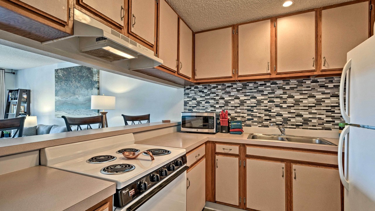 KITCHEN: Refrigerator, ice maker, coffee maker, stove/oven, microwave, toaster oven, dishware & flatware, cooking basics, spices