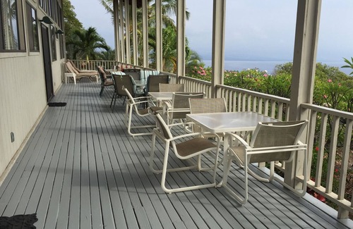 Most of our guests especially appreciate the wrap-around lanai, which includes 840 square feet facing the ocean. The lanai has five table-and-chair sets, two lounge chairs, two small tables, and a gas barbecue, which makes it perfect for communal meals or individual relaxing and reading.