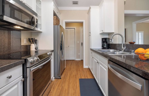 Adorned with elegant Polynesian-style decor, this townhouse villa offers a seamless blend of comfort and luxury. The fully equipped kitchen features high-quality appliances and utensils perfect for culinary adventures. Relax in the family room on plush sofas, catching up on your favorite shows on the 50-inch Smart TV, or stay connected with high-speed WiFi and unlimited phone service to the U.S. and Canada.
