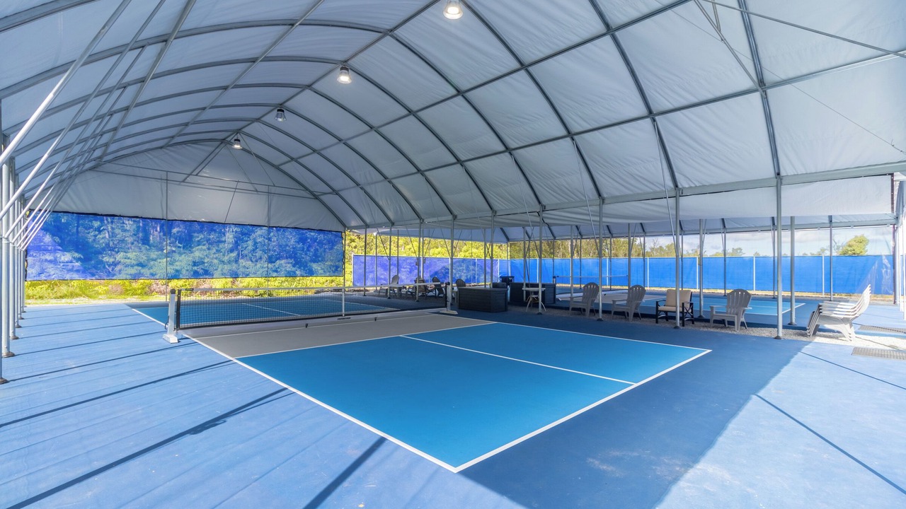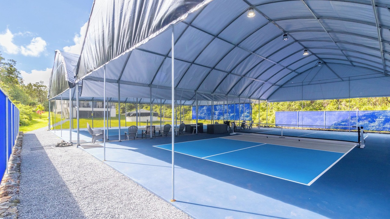Hawaii Pickleball Addicts Lodge is a beautiful, large private home with 2 covered Pickleball Courts (35' x 60' x 22' each) on 2 acres in Mountain View, HI, close to Volcano National Park, Kea'au, Kalapana Black Sand Beach, Uncle Robert's Awa Bar and Farmer's Market, and Hilo on Hawaii Island aka Big Island. Specifically created for large groups to train, compete or just build lifelong memories while enjoying Pickleball around your adventures throughout Hawaii Island. The house is spacious and comfortable with two levels totaling 3500+ square feet making it perfect for large groups or multi-families traveling together. House has 5 bedrooms + 2 dens configured for additional sleeping areas, 3 bathrooms, 3 living rooms, and lanais on each level that offer views of the large 2 acre parcel and TWO covered pickleball courts. Great for large groups with 9 beds total (1K, 5Q, 1D, 2S). Perfect space for your family or group to play or train your pickleball skills while you explore all the magic the Big Island of Hawaii has to offer. Enjoy walking through, or gazing over two acres of land, listening to the sounds of the birds and being surrounded by lush green forest with light breezes.