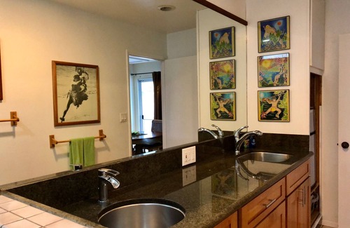 Walk up a few steps to your private entrance to a large, spacious, airy, 580 sq.ft. Studio, furnished with a king bed flanked by elephant bamboo side tables, bamboo flooring, elephant bamboo armoire that holds a tv, a bistro sized table, leather love seat and chair with ottoman centered by a warm comfortable rug, breakfast table, and elegantly beautiful Hawaiian themed artwork on the walls and a cooling ceiling fan and trade winds.