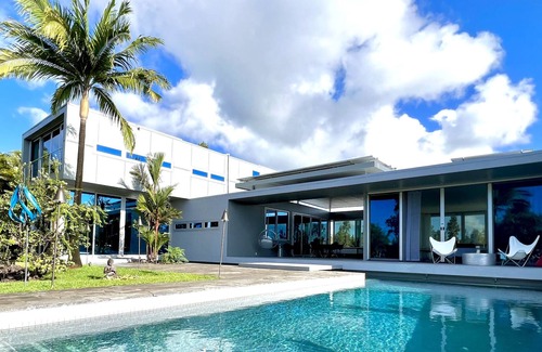 This luxurious modernist masterpiece with swimming pool and ocean view, sits in a serene setting in the untouched area of the Puna Coast on the Big Island of Hawaii. If you love great design and style, fantastic tropical weather, rugged yet lush landscapes, blue ocean, and relaxation, then you will love this place for your next vacation. The unique combination is a stunning contrast of rugged landscape and sharp minimalist architecture. This is a shared family home with a Main house and Studio.