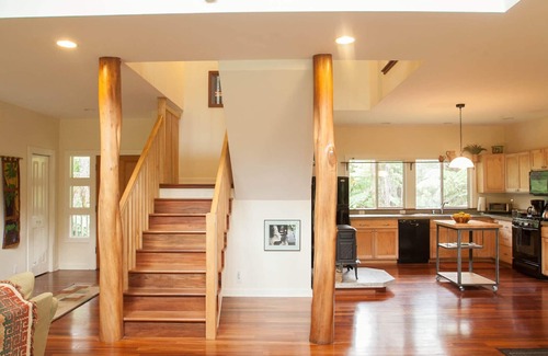 The house has a open floor plan downstairs and lots of windows to look out on the rainforest. It is a good layout for large groups or families as it facilitates connection, but also has private feeling bedrooms upstairs that have some separation from each other. The master bedroom has its own bathroom, and there is another full bathroom upstairs for the other two bedrooms. We have a laundry room with a washer and dryer, a smart TV with high speed wifi.