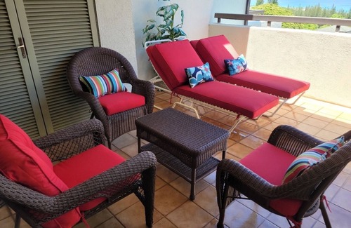 The living room is nicely furnished and decorated. There is a wide screen TV's and Blu-ray players for your enjoyment. The kitchen features granite counters. Appliances include; stove, refrigerator, microwave, dishwasher, coffee maker, blender, toaster and rice cooker. The large bedroom has a very comfortable NEW king-size mattress. Both the living room and bedroom have sliding doors on to our double wide private lanai which has awesome, unobstructed, ocean views. The floors are tiled and have carpeting in the living room and bedroom areas. The Villa is approximately 1338 square feet which includes the Extra Large private lanai. Our Villa has a level entry and is all on one level. There are no stairs to climb. We have provided an 'Availability Calendar' for your convenience. We invite you to take a look at our traveler 'Reviews' at the bottom of our listing! You are welcome to contact us for any reason.
