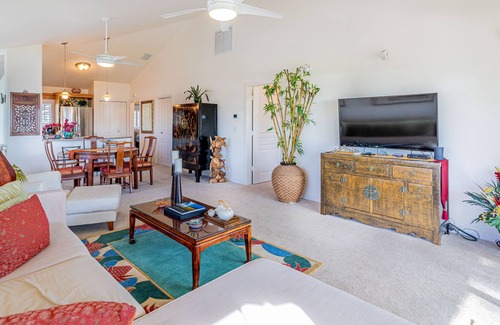 This nicely decorated and upgraded Ocean View home in the gated community of Kai Lani was used as the Owner's Vacation Home and not rented until now. The home has many custom built-in's in the bedrooms, new carpeting and upgraded Stainless appliances. The TV's have been recently upgraded to new large screen Smart TVs for your evening entertainment. There is High Speed wireless Internet service provided by Spectrum with advertised speeds of 400 Mbps so you can work, play games and/or stream your favorite content. You sit on your lanai and watch some of the most spectacular sunsets you'll ever see! Better yet, grab your favorite beverage, maybe some snacks and take the short stroll to the secluded cove and beach in front of Kai Lani and watch the sun set while sitting under the Banyan Tree.