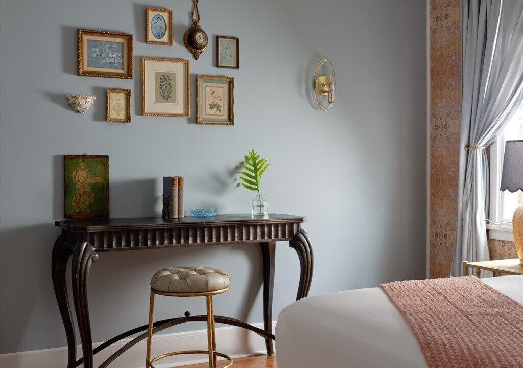 ✔ Antique furnishings paired with plush, modern bedding