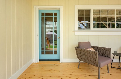 Upstairs is an open large loft bedroom with a king bed, a twin trundle bed (sleeps two) and a 1/2 bath. Next to the loft is a breezy sleeping porch with an additional twin bed. Featuring views of the ocean and Maui, the fully-enclosed porch is also perfect for reading, yoga, or a private massage.