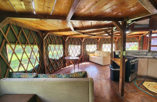 This unique 1500 square foot glamping space features 2-stories of unique living space. The 4 bedroom open concept floor plan features 6 beds, a kitchen and a bathroom attached to the yurt, and a hot outdoor shower near the front of the yurt. The first story has the kitchen, living space with 2 pull-out sofa sleepers (one double & one queen), and a separate bedroom with a queen bed. The second story has 3 open-concept bedrooms, one with a queen bed, one with a full bed, and one with a twin bed and loveseat couch. The yurt can sleep up to 11 people. Please note that there are no doors to any of the open-concept bedrooms. All bedrooms have only partition walls with open walkways between the rooms (see pictures) and no bedroom doors. The hot water in the bathroom is glitchy, sorry, but there is an additional outdoor shower available with hot water near the yurt. There is no dining room, but the bar counter top has 4 stools. Some of the fabric windows on the yurt do not close properly and the windows do not have screens. Please remember this is a yurt, so there is minimal framing, no drywall, and all rooms are connected & open, except for the bathroom which does have a closeable door. No drywall on the walls means that electrical boxes and wires are exposed, which is why we disclose that this is an unsafe space for children & infants.