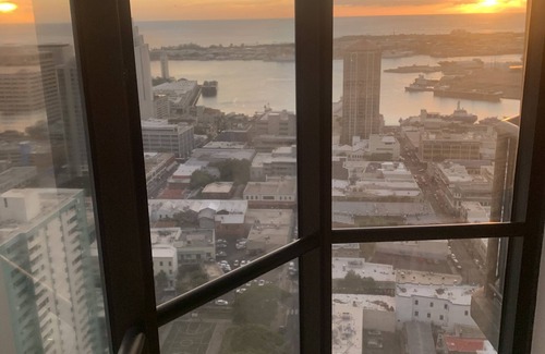 30 day minimum; 4800 monthly rate.Located in the heart of downtown Honolulu, this 40th floor Penthouse is one of a kind. Equipped with sunrise and sunset views, this spacious 1 bedroom 1 bath boasts 726 interior square feet and an additional 525 sq ft private rooftop Lanai, and sleeping arrangements for 3 people... Unobstructed ocean views stretching from Kapolei to Hawaii Kai from the comfort of your own lanai make for an unforgettable experience. Stargaze by night and enjoy coffee while the sun rises over Lanai every morning. This Penthouse overlooks Aloha Tower, Historic Honolulu Harbor, Chinatown, and the Arts district. This location is steps from world class international dining at a fraction of the price you would pay in Waikiki. Add covered parking, outdoor swimming pool, jacuzzi, personal unlimited use of washer dryer, and BBQ area, and just 1.2 miles to Ala Moana mall and Beach Park, you have everything you need at your fingertips. Walk 1 mile to the trendy Kakaako district, swim and surf at Kewalo Basin or Waikiki beach, and just 8 miles to Windward Oahu beaches and attractions. A 45 minute drive to Haleiwa town and North Shore surfing make it a very convenient home base. Over 100 restaurants are within 1/2 mile of this penthouse.