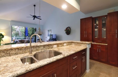 This 1 bedroom condo is roomy and light with soaring cathedral ceilings. The bedroom has its own air conditioner & can be shut off from the rest of the living area for privacy. There is a full kitchen with granite countertops, electric range & oven, large refrigerator, new dishwasher, microwave and all the cooking utensils you will need. Just off the kitchen is a dining area which adjoins the living room with sofa & love seat. In July, 2014 all tile was replaced, new cabinets installed with granite countertops and a large shower with rainfull showerhead was installed in the bathroom. New stainless steel refrigerator and range were installed, and new washer and dryer installed. A new 46' flat screen TV was added along with new TV cabinet. The lanai also was retiled.