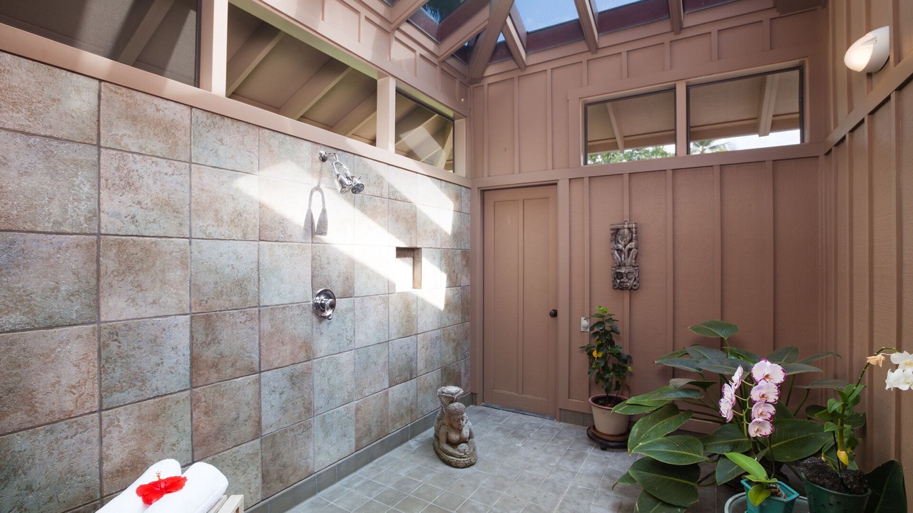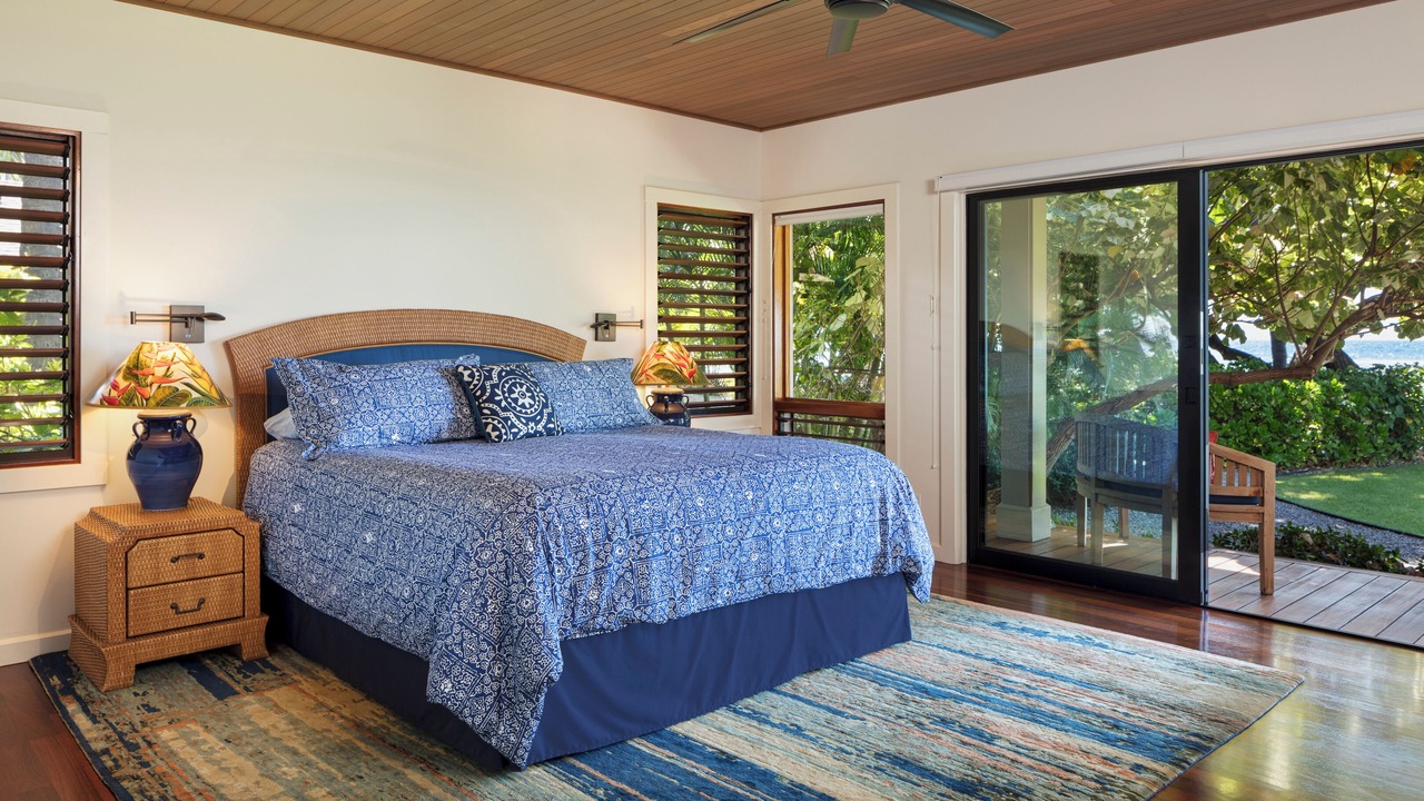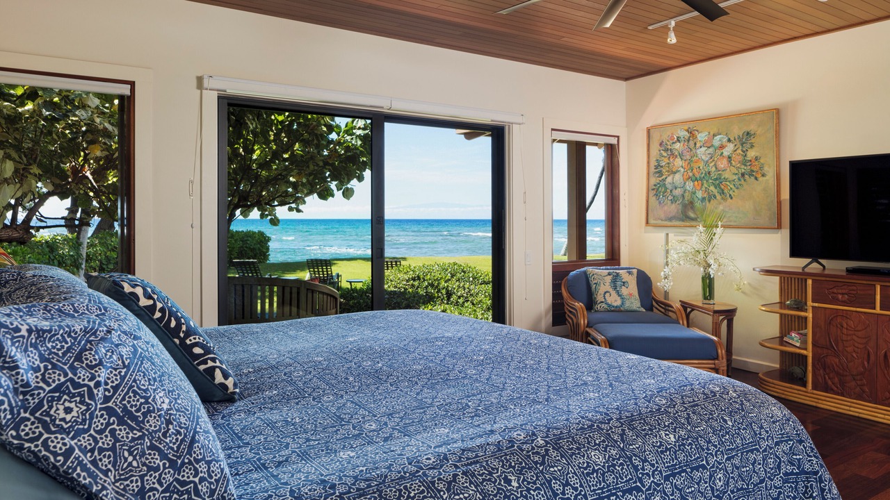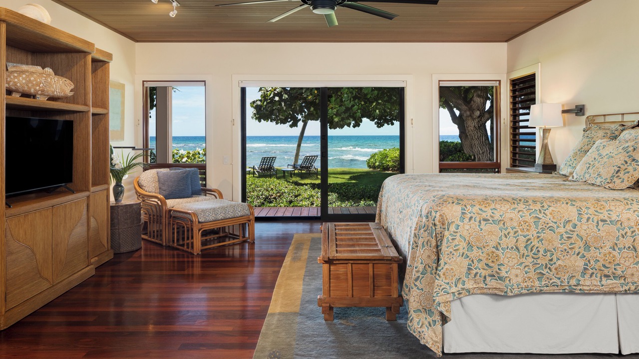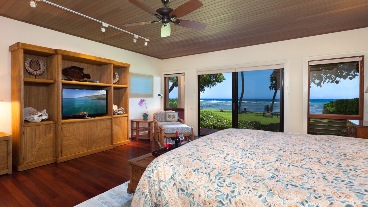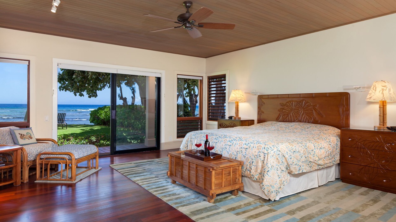 We have four large bedrooms each with maximum privacy. The Kona and Kohala suites are on the main floor and both have stunning ocean views and doors that open onto the lanai. Each suite has been beautifully appointed with new King mattresses and new linens. Both have large bathrooms with a separate dressing area and a large "open air" (but enclosed shower) filled with tropical plants and flowers.
