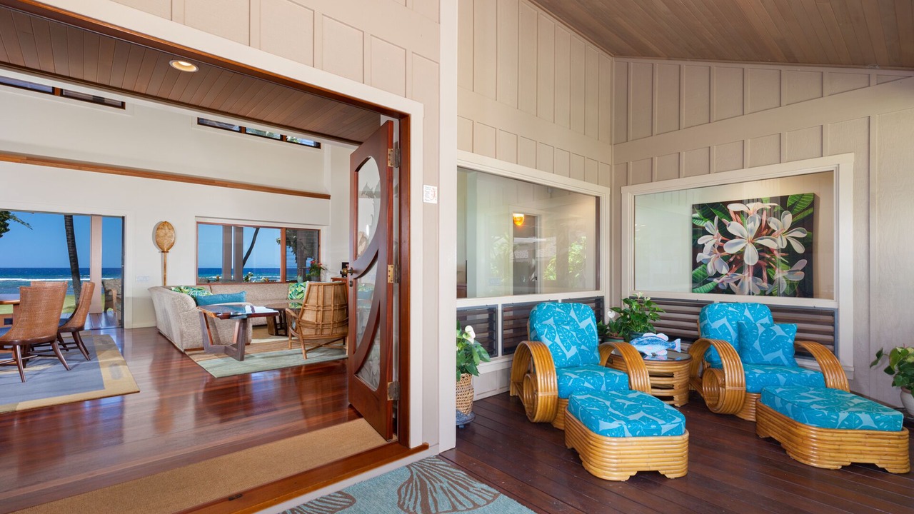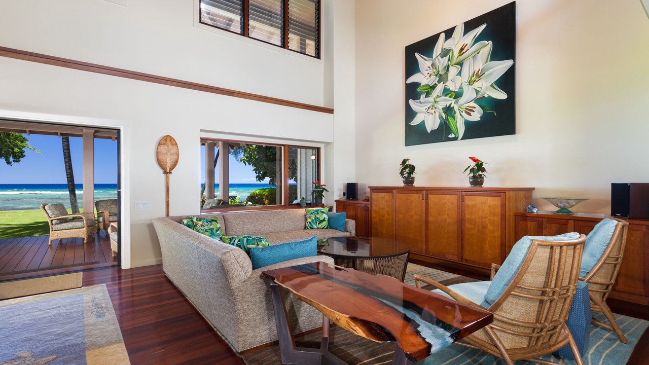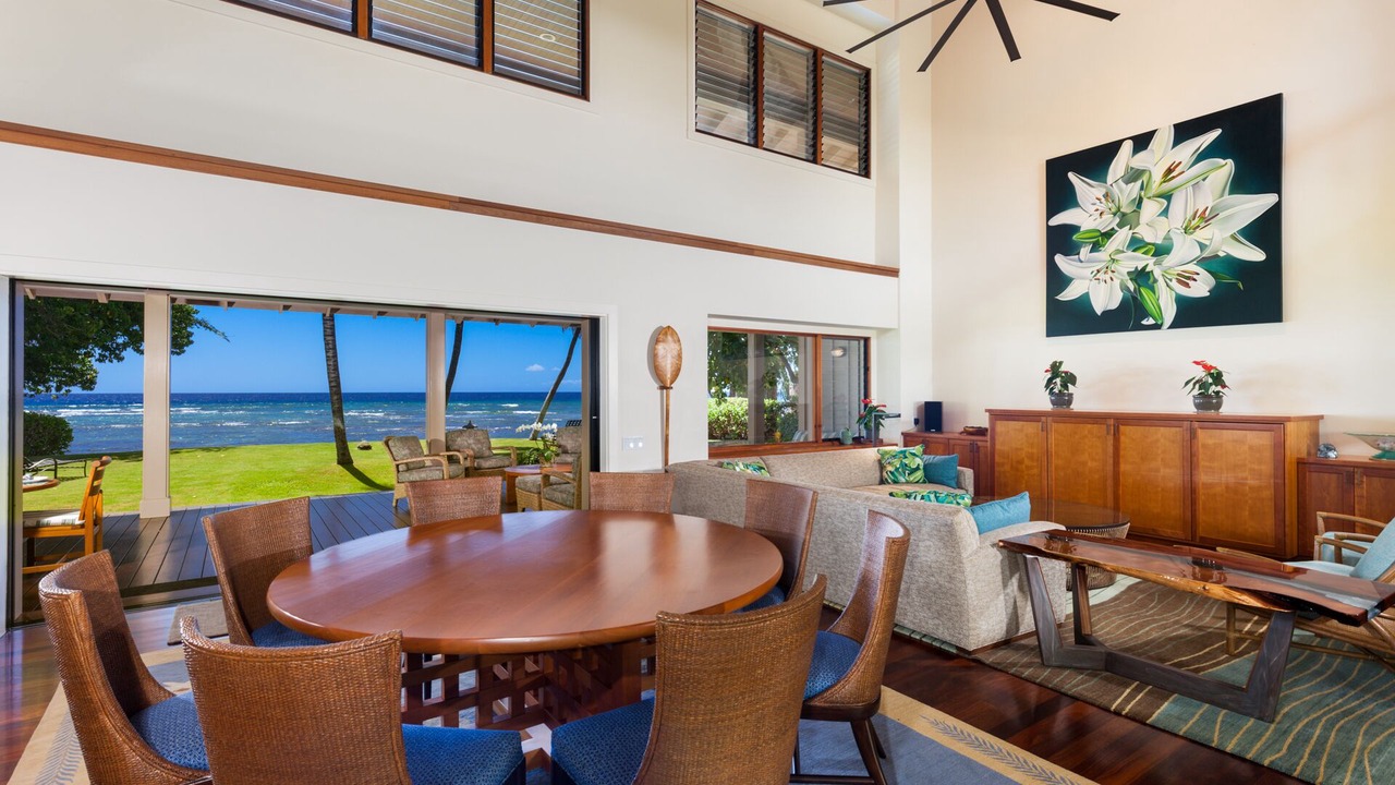 The two-story Great Room is very inviting. The wall of sliding glass doors can be pushed all of the way open and the locking screens can then slide into place. The large oceanside lanai has a dining table for 8 to 10 guests. The lanai also has comfy chairs for relaxing and a "punee" for lounging. There is a built-in bar, and a Weber grill just off the lanai. The small sandy beach just to the left of our home, and that is great for playing in the sand with the kids and we have a few buckets and toys in the guest garage. We have beach chairs and umbrellas and pool floats, but these floats etc. are just toys and not life-saving devices. And please don't take them to the ocean.