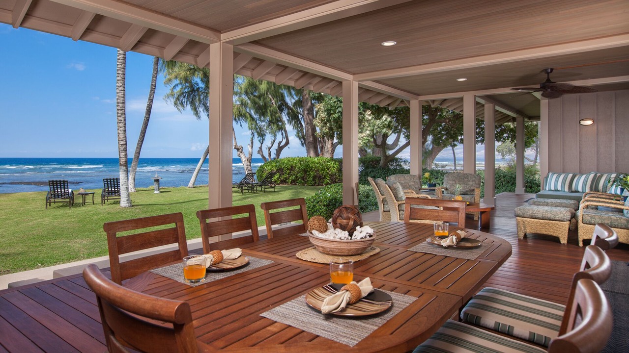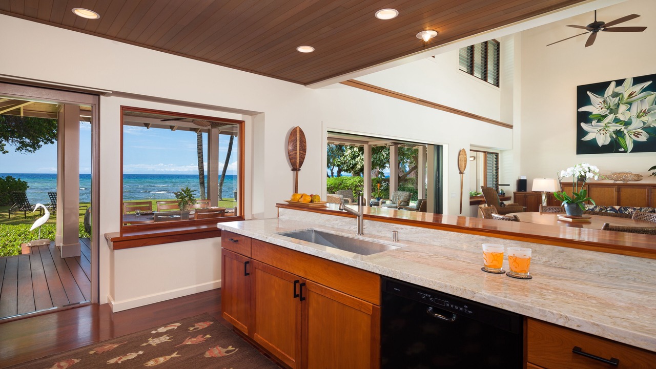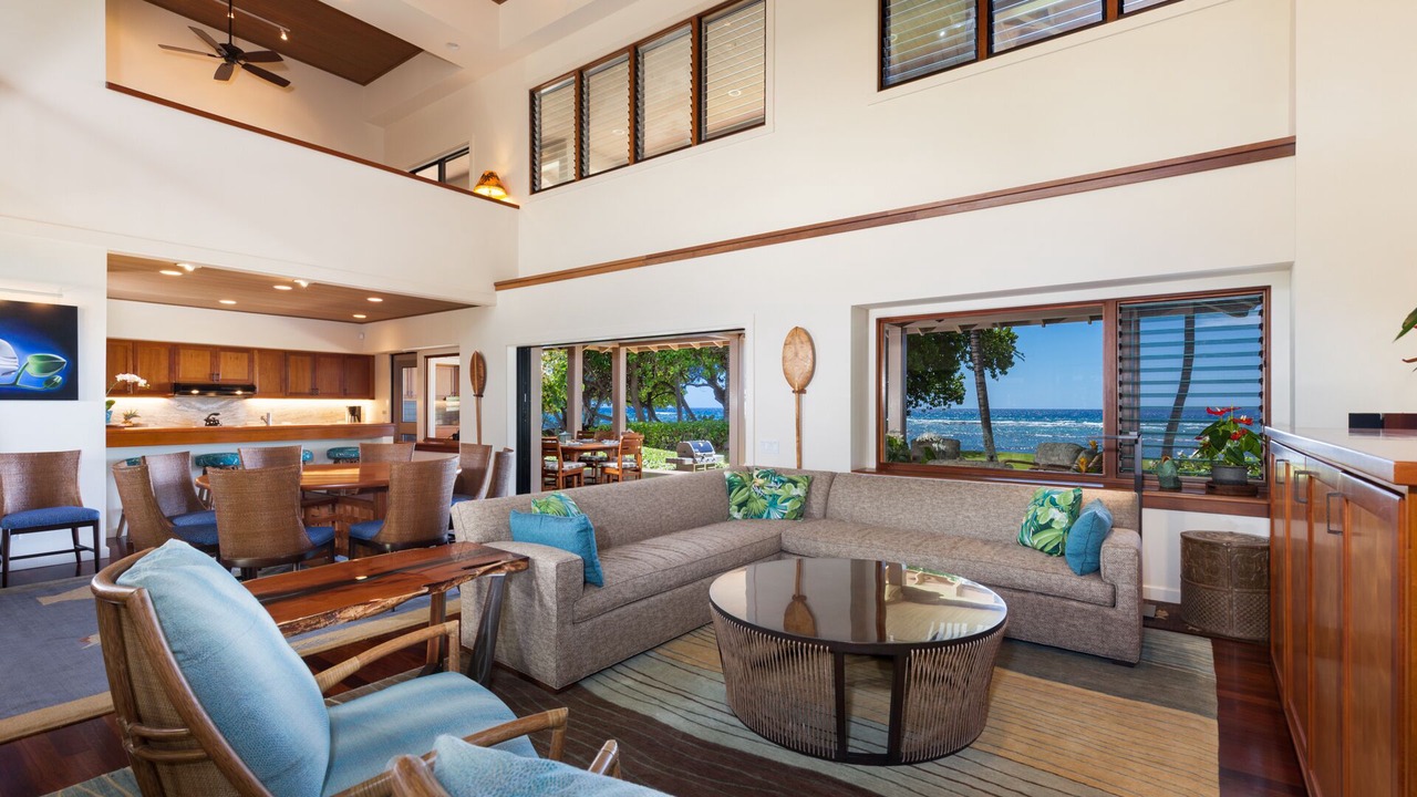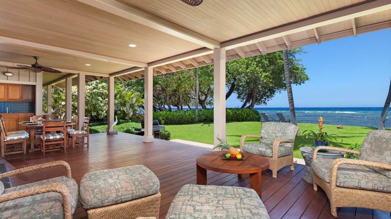 The two-story Great Room is very inviting. The wall of sliding glass doors can be pushed all of the way open and the locking screens can then slide into place. The large oceanside lanai has a dining table for 8 to 10 guests. The lanai also has comfy chairs for relaxing and a "punee" for lounging. There is a built-in bar, and a Weber grill just off the lanai. The small sandy beach just to the left of our home, and that is great for playing in the sand with the kids and we have a few buckets and toys in the guest garage. We have beach chairs and umbrellas and pool floats, but these floats etc. are just toys and not life-saving devices. And please don't take them to the ocean.