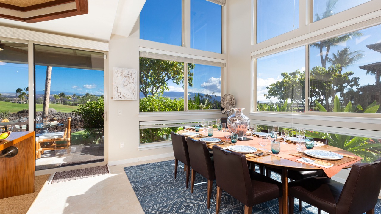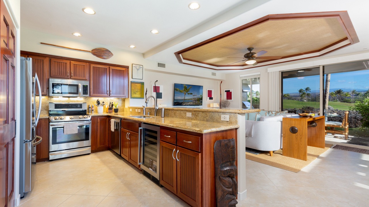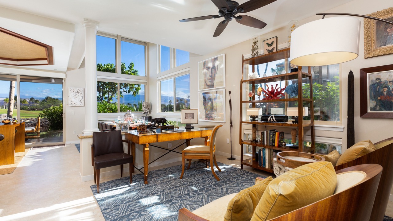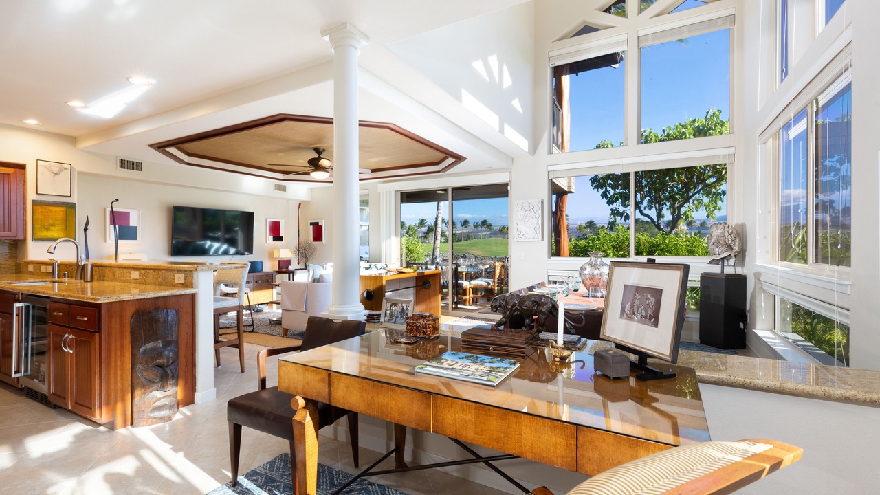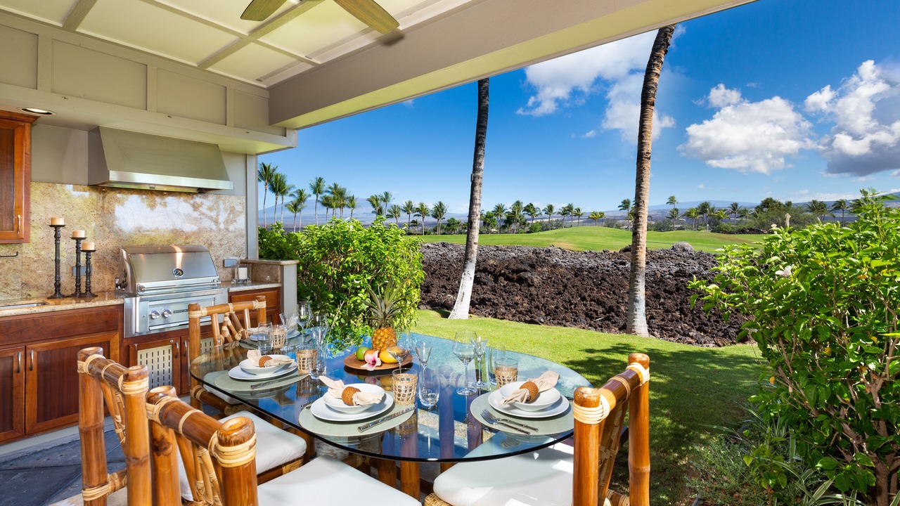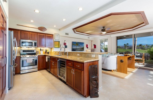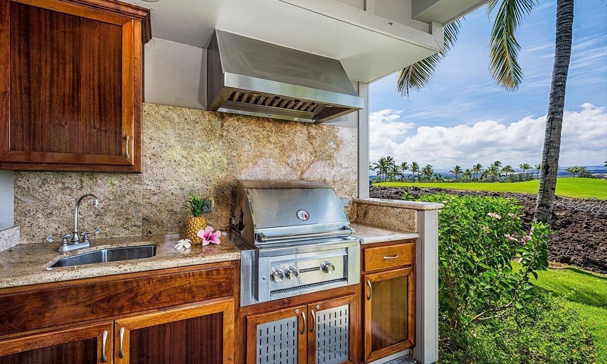 The Kitchen opens out onto the open floor plan of the Family Room, Dining Room, Library and the Private Dining Lanai. From your lanai, enjoy uninterrupted views of the lush tropical landscaping, golf course fairways and distant Mauna Kea Mountain range. The lanai is furnished with outdoor dining seating and has an outdoor kitchen with sink, new propane gas INFRARED BBQ.