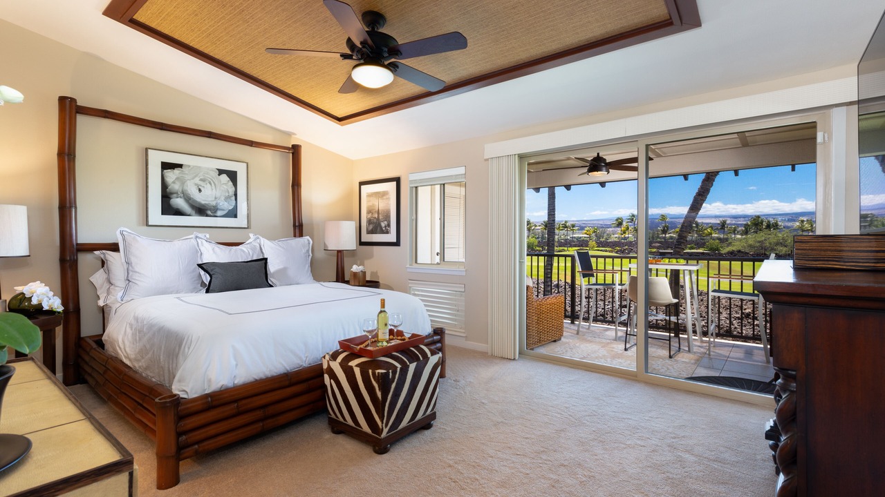 The master bedroom boasts a Cal King bed with a new luxury Beautyrest mattress and adjustable base. 70” flat screen with Apple TV. A large private lanai with dining table and lounge chair overlooking the mountains and fairway views, enjoy a morning coffee in the warm Hawaiian sunrise overlooking uninterrupted Mauna Lani Mountain views over the 4th fairway.