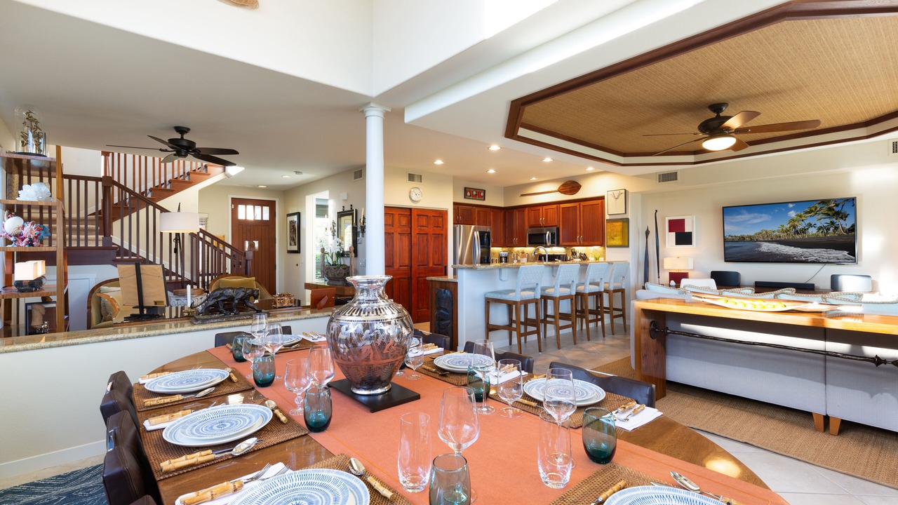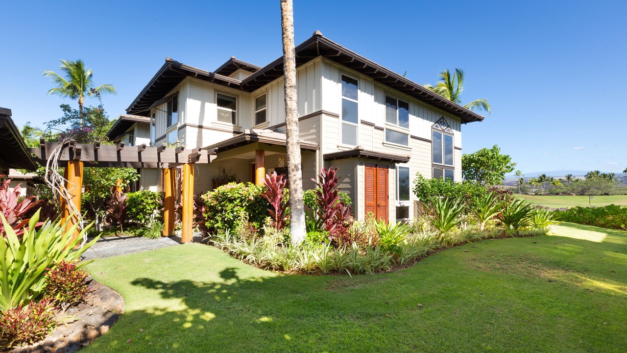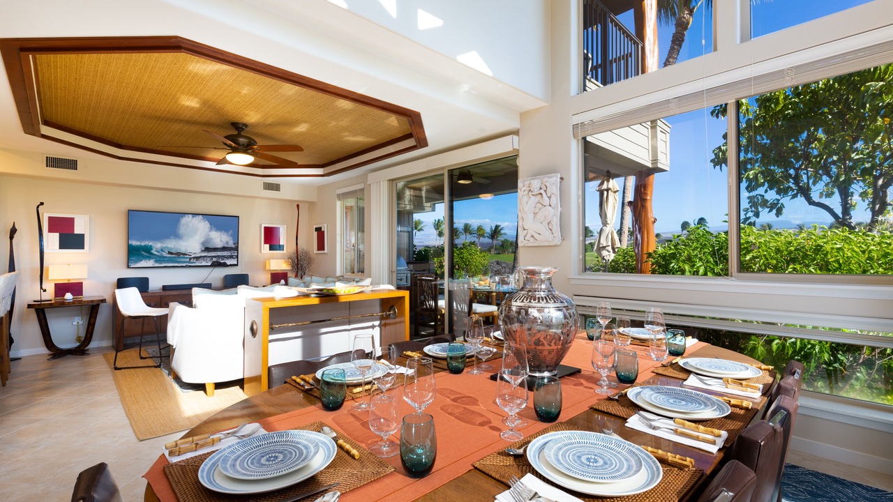 Our very private Newly remodeled, 2 story corner Villa has the largest floor plan encompassing 2,321 sq. feet and 20 ft ceilings with two full height walls of glass to take in the tropical view. The Balinese style luxuriously furnished three bedrooms plus sleeping loft with a new queen size sofa bed, three bath home provides an excellent unobstructed view of the golf course, lakes, and the often-snow-capped Mauna Kea mountains and observatory at 13,796 ft (4,205m).