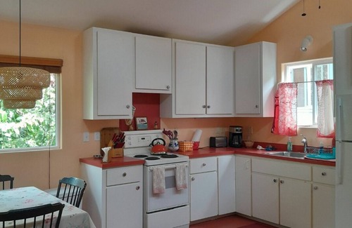GE-186-363-6992-01 TAT186-363-6992-01This colorful 2 bedroom 2 bath home is Hosted from the front cottage. Close to all the fun Puna has to offer. The quiet setting has privacy with room for family & friends. Let the sound of the waves rock you to sleep. Maybe even hear the whales. Gardenias fill the garden with a wonderful aroma. Colorful tropical plants sway in the breeze, creating a delightful view from the fully screened lanai. The house is set up to sleep two couples with new queen size beds that connect by the lanai. Both rooms exactly the same except color schemes. All linens are new and are the appropriate weight for the climate for a comfortable stay.The house is super cute in a simple way .The full kitchen allows for home cooked meals.
