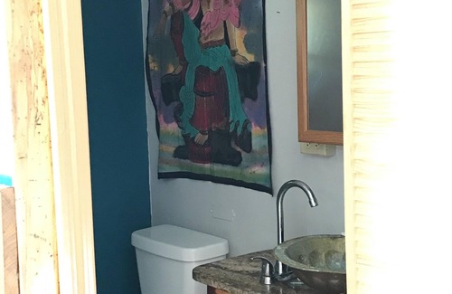 Special care was taken to select, mill and install wood trim that is just gorgeous to look at with mango, koa, cedar, and redwood that creates art with wood. I have collected wooden masks, statuary, and artworks from Africa, Polynesia, Asia and the Middle East. The stuff you write home about. There is also a solar heated homemade hot tub that is a cozy fit for two out and under the stars.