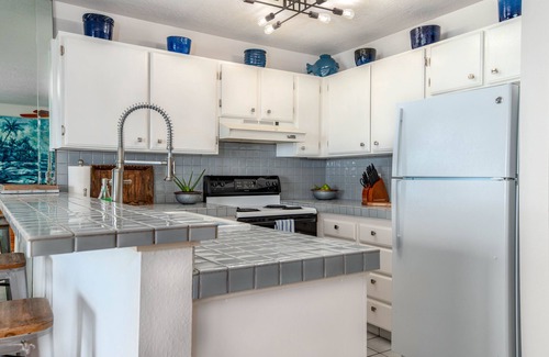 The Kitchen is clean with a refrigerator/freezer, all the necessary appliances including a dishwasher to make clean up a breeze. Coffee, tea or a smoothie made in a snap with the, coffee pot, french press, electric tea kettle and a Rocket Blender. Stylish dishes, silverware, cloth napkins and glassware will allow you to set a beautiful table. Blue water views from the kitchen along with cookware, bakeware and utensils will have you cooking meals with ease.