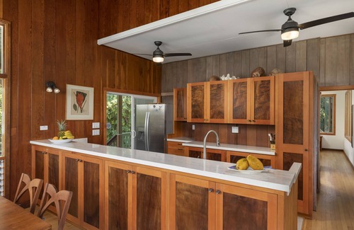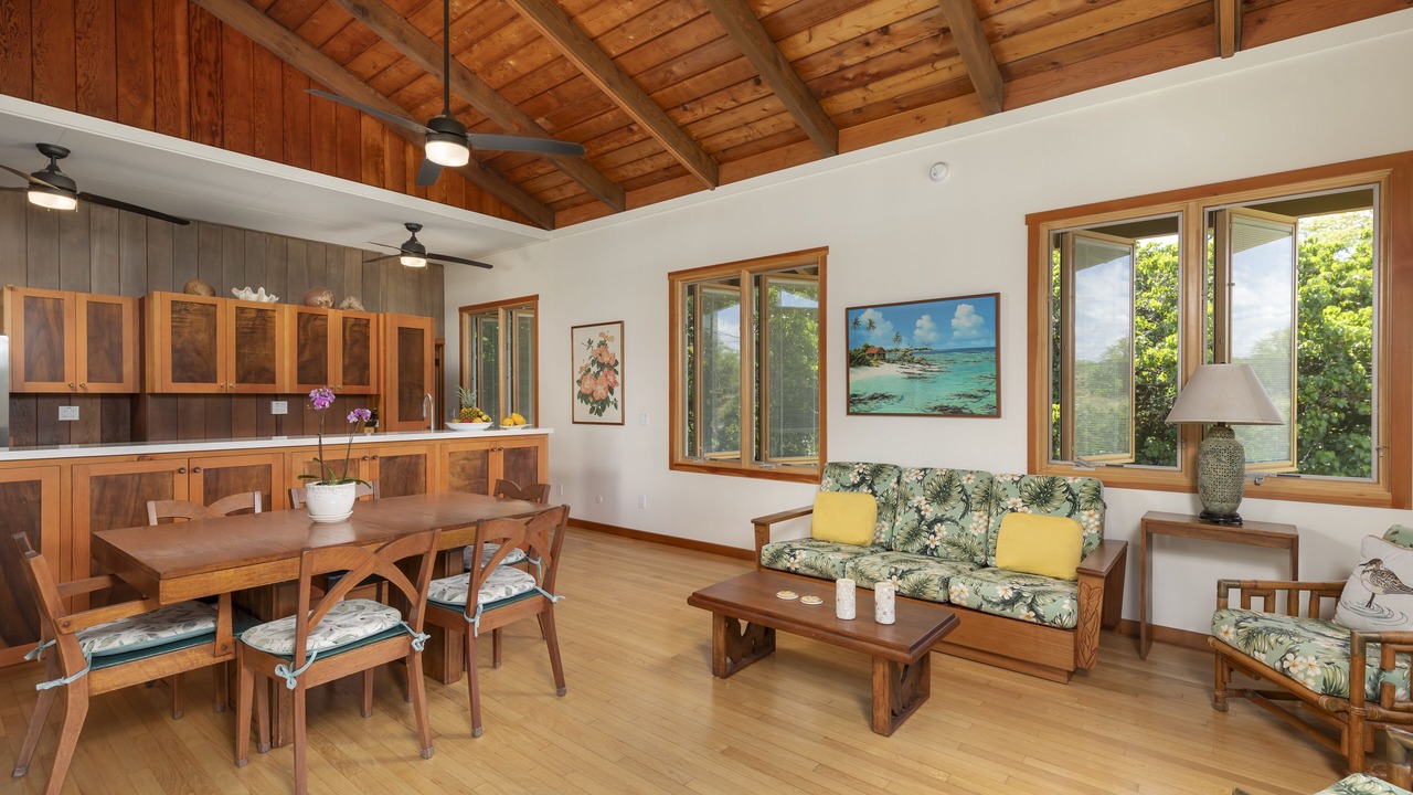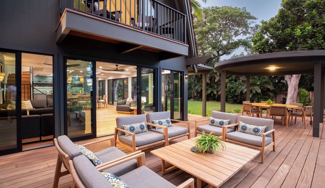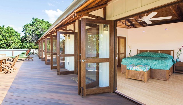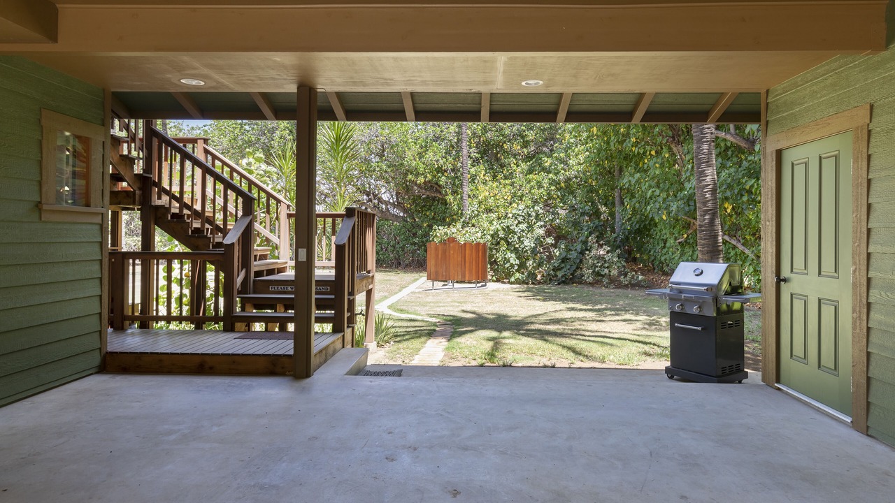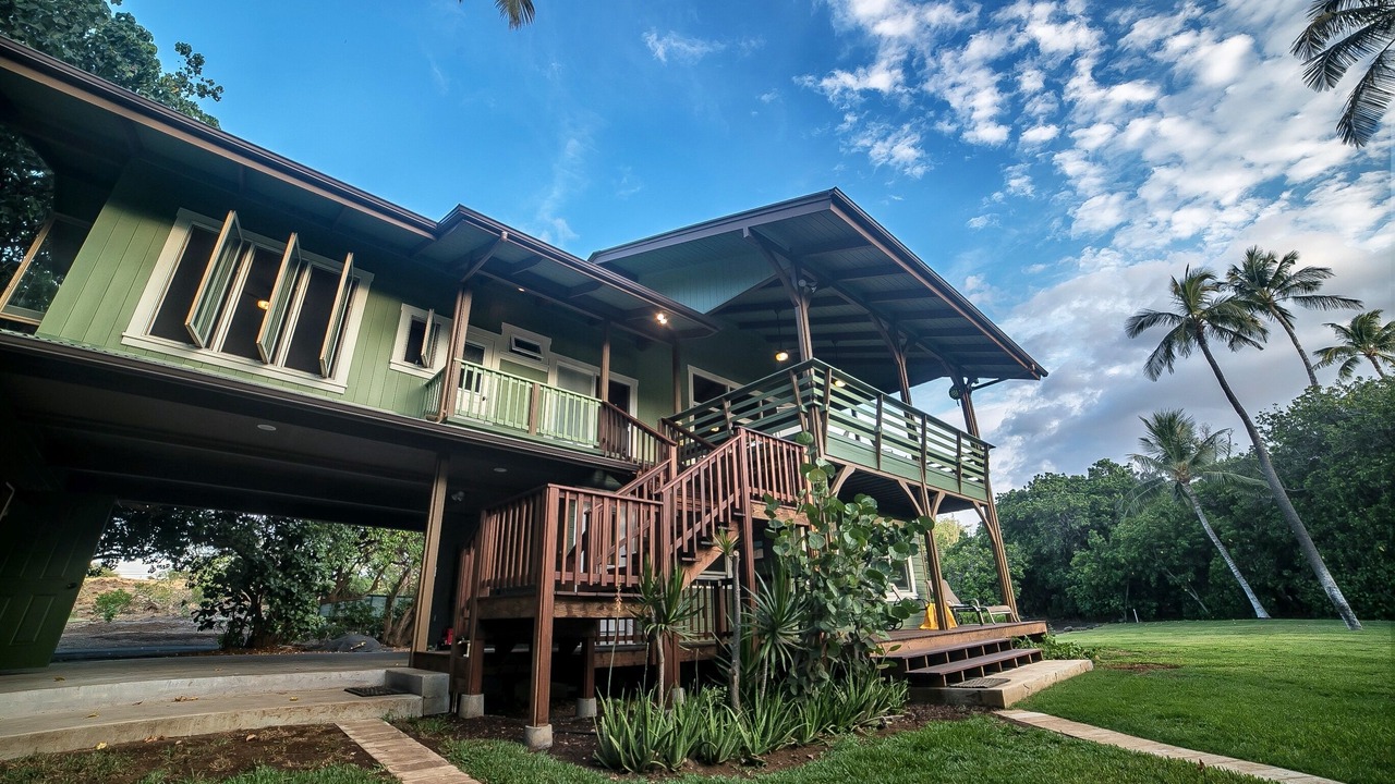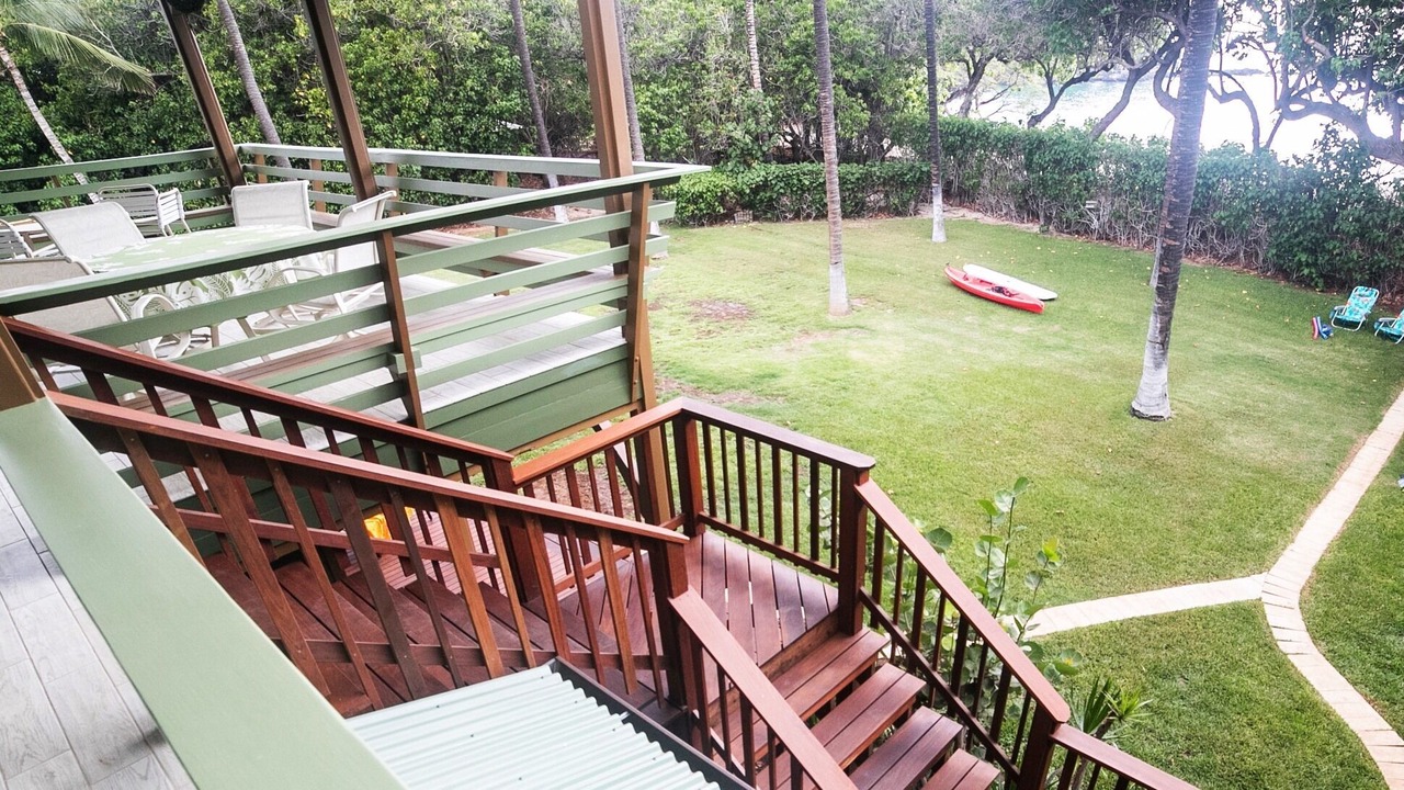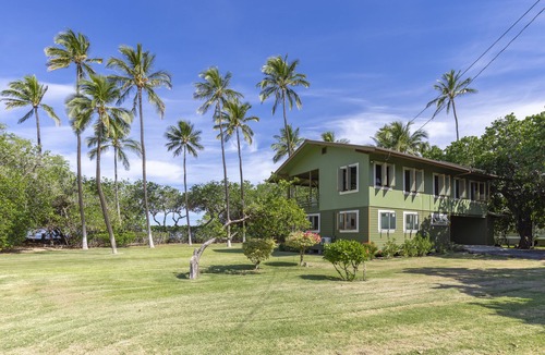 Nestled along the shoreline of Waialea Bay, Hawai‘i, Kolea is a beautifully renovated two-story beach house offering a tranquil, private escape with beach access at your fingertips. Built with clear‑fir walls, oak flooring, and custom koa cabinetry, the home’s design evokes warmth and elegance, while mature landscaping ensures both serenity and seclusion—yet it's merely steps from the ocean. Upstairs, the light-filled living area and kitchen under a high-beamed ceiling open onto a spacious covered lanai ideal for dining or unwinding with ocean views. Downstairs, the lush grassy yard invites barefoot play, with an outdoor hot-and-cold water shower providing a refreshing rinse after sandy beach adventures. Air conditioning is available in all bedrooms for added comfort, but many guests prefer the open breeze and ceiling fans for that genuine tropical experience.