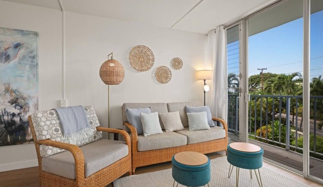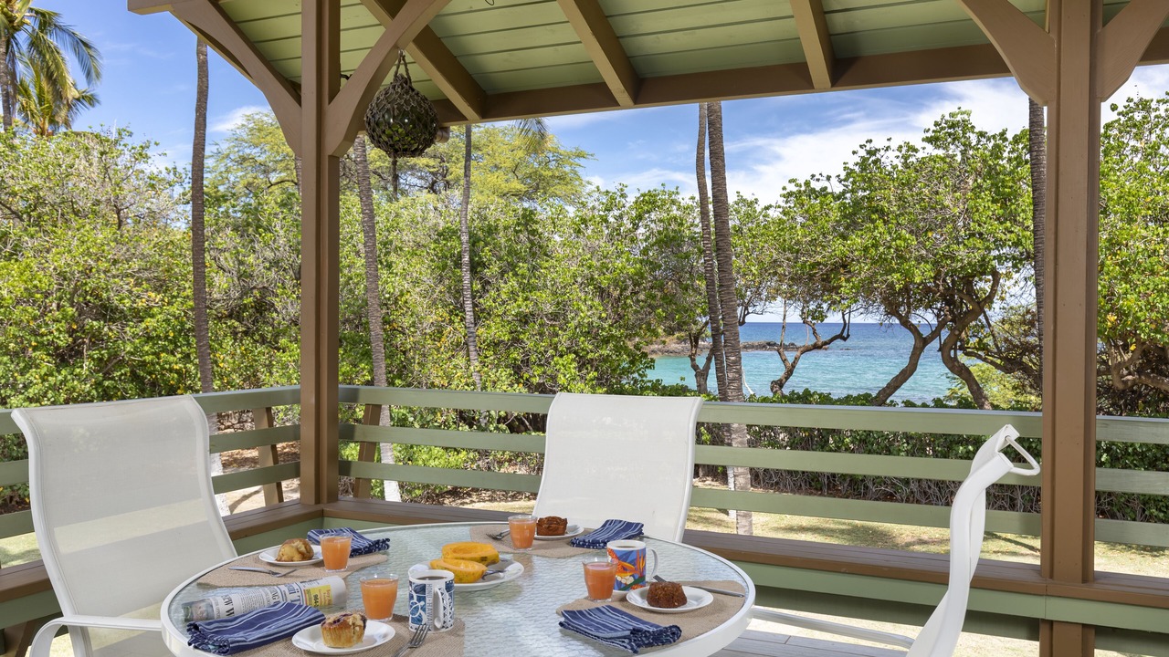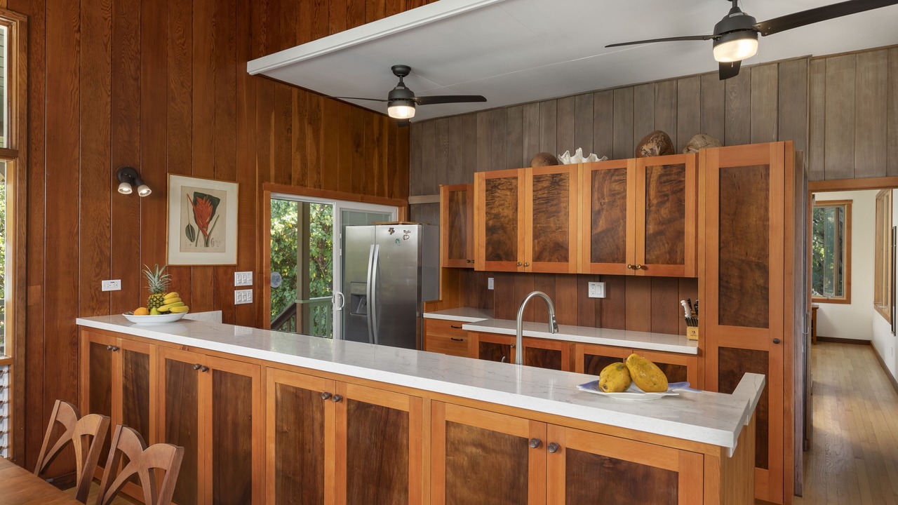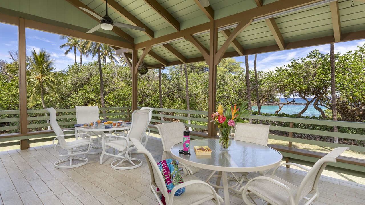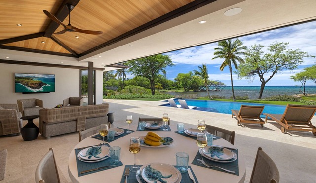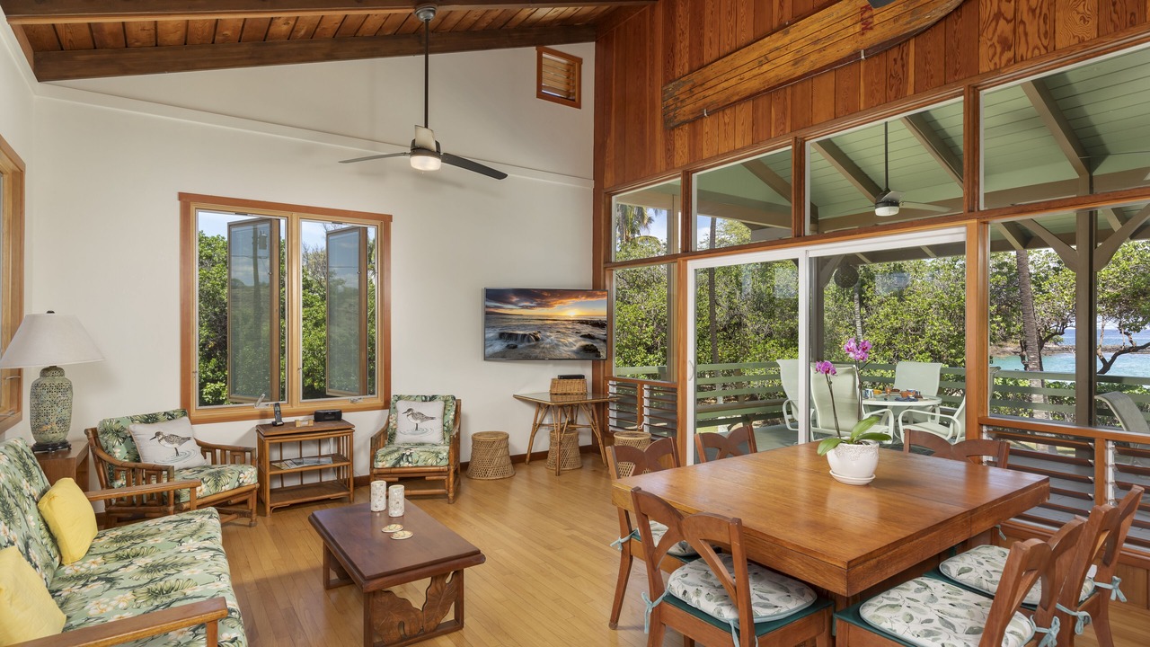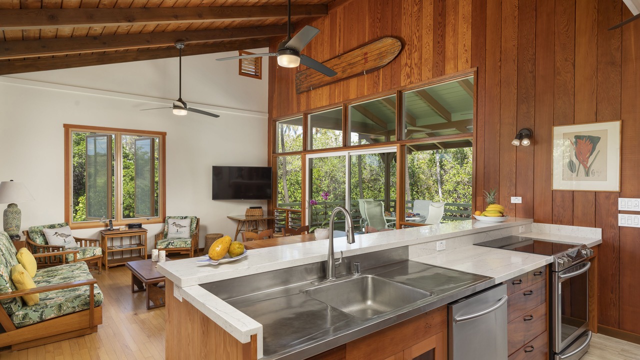 Nestled along the shoreline of Waialea Bay, Hawai‘i, Kolea is a beautifully renovated two-story beach house offering a tranquil, private escape with beach access at your fingertips. Built with clear‑fir walls, oak flooring, and custom koa cabinetry, the home’s design evokes warmth and elegance, while mature landscaping ensures both serenity and seclusion—yet it's merely steps from the ocean. Upstairs, the light-filled living area and kitchen under a high-beamed ceiling open onto a spacious covered lanai ideal for dining or unwinding with ocean views. Downstairs, the lush grassy yard invites barefoot play, with an outdoor hot-and-cold water shower providing a refreshing rinse after sandy beach adventures. Air conditioning is available in all bedrooms for added comfort, but many guests prefer the open breeze and ceiling fans for that genuine tropical experience.