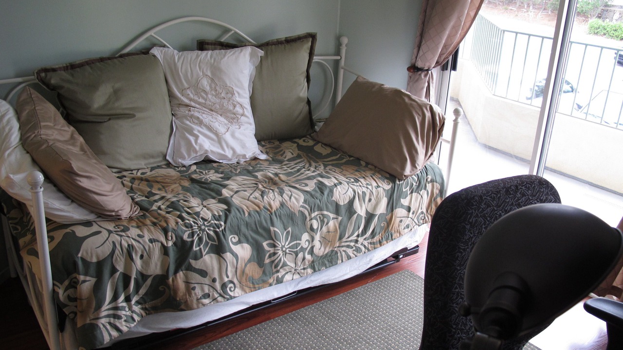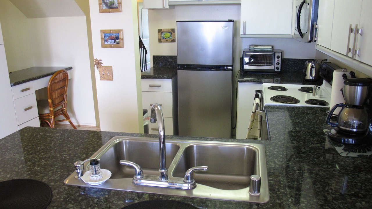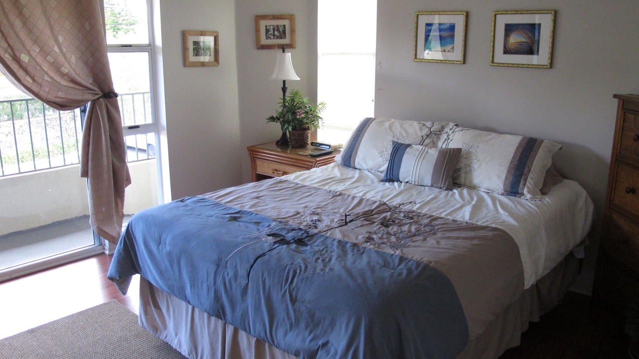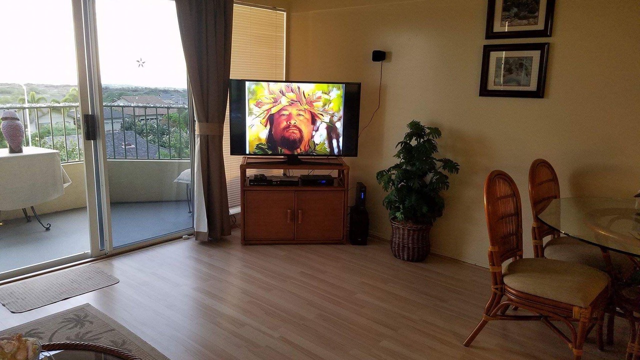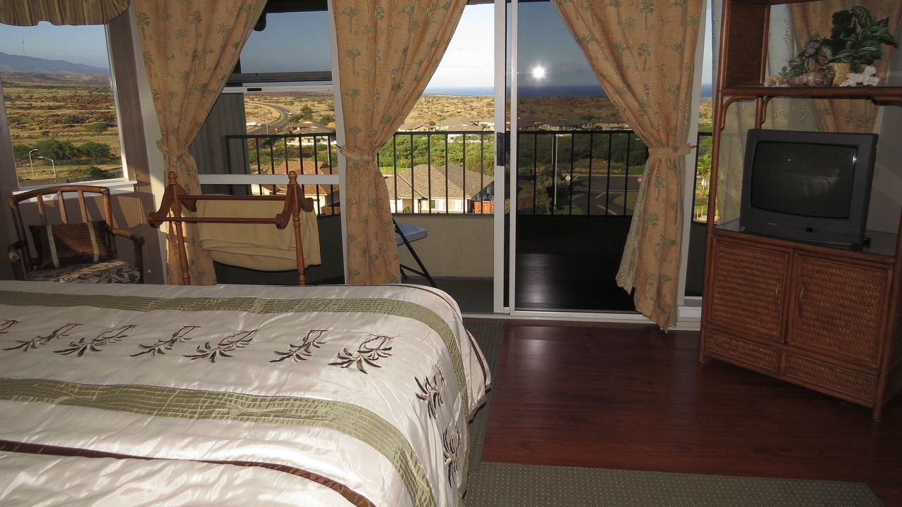 There is no A/C however, each bedroom has it’s own bath, ceiling fan and sliding glass door out to it’s own lanai. The kitchen and living room (with bay window and ceiling fan) and master bedroom have stunning views of the ocean, Hualalai Mountain and beautiful tropical sunsets. It is decorated throughout with Hawaiian furnishings, rattan furniture and Hawaiian photos. The living room is appointed with a 48 flat screen tv, surround sound, stereo and dvd/cd player. Wireless Internet and cable tv are also provided . We also have installed flat screen tvs in all bedrooms.