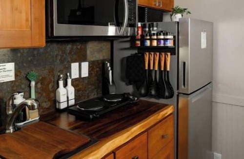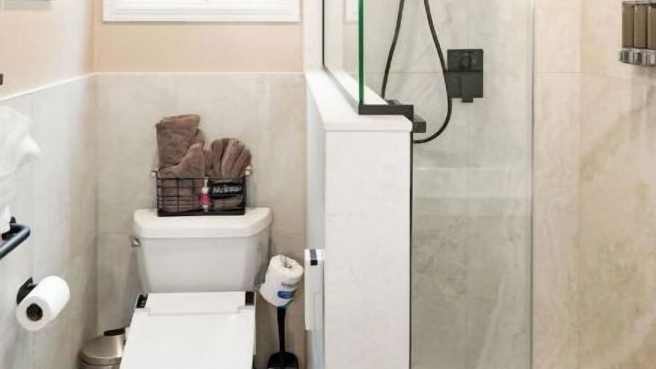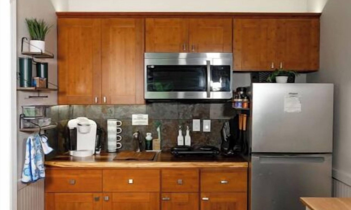 There is a comfortable living space, a large TV, board games, and a kitchen with a microwave, two burners, a refrigerator, a Keurig coffee maker, a rice cooker, kitchen utensils, and cookware. The bathroom has a beautiful new walk-in shower, bidet, shampoo, conditioner, and body wash.