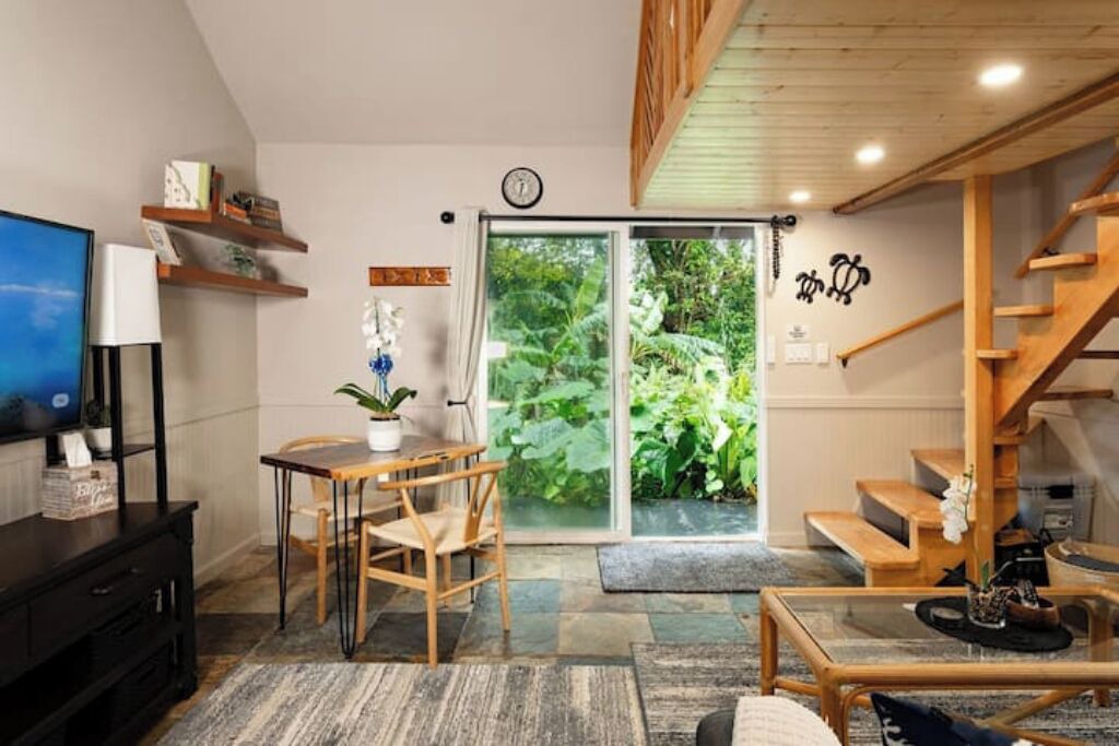 The Waimea Honu Studio/COTTAGE is a separate space attached to the garage. The Studio is newly renovated and has a queen sofabed on the bottom floor and a loft up the floating stairs. The loft clearance is roughly about 5 feet, 6 inches high, so be prepared to be humbled. The loft has a full-size bed, dresser, closet space, lamp, and clock for comfort.