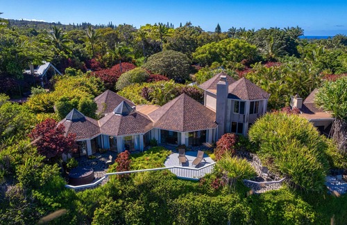 This elegant home features an open concept with teak wood accents. The unique floors are Javanese marble brought in from Bali. The King size bed is set beneath a vaulted ceiling with a skylight, perfect for stargazing! The ocean-facing lanai, with a private hot tub, overlooks the unforgettable beauty of Maui's ocean and valley. A tropical paradise with an emerald tile pool, private sunning areas, landscaped outdoor shower, and poolside dining with a gas barbecue.