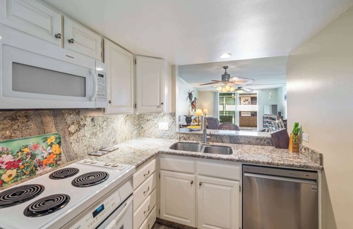 The home’s chic interior is a cool retreat from the heat, adorned in tropical themed décor and comfortable, contemporary furnishings. Curl up on plush living room sofa or recliner seating while you stream a new movie or episodes of your favorite shows on the smart TV. Steps away, the dining room table can accommodate 4 for formal meals or an afternoon round of cards while 2 high-top stools at the counter can help serve you up for quick and casual bites. The full and modern kitchen offers everything you need to whip up convenient meals right from home, with ample countertop space and cabinetry for meal preparation and storage. Brew up a fresh cup of morning coffee and head back to the balcony (partial ocean views) to sip on your fresh cup while planning out the next round of daily adventures.