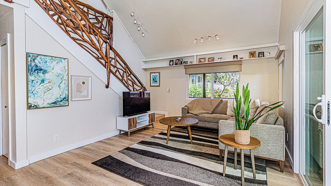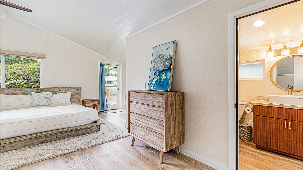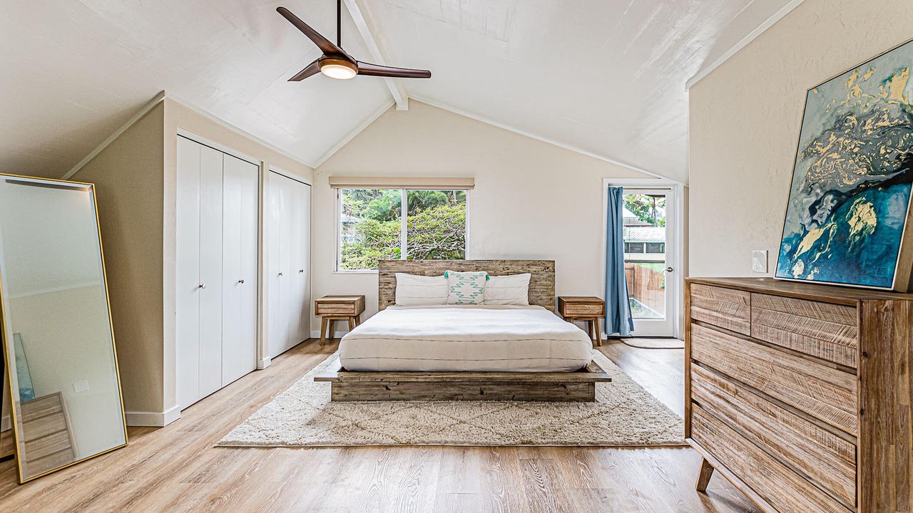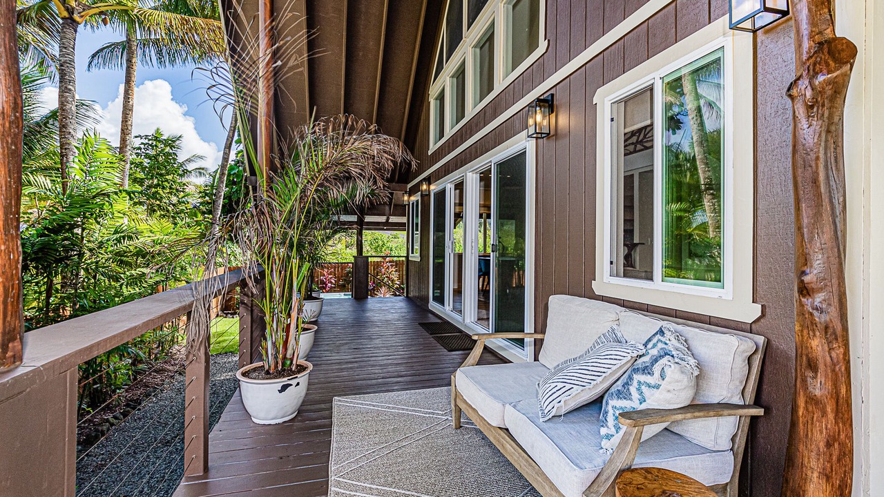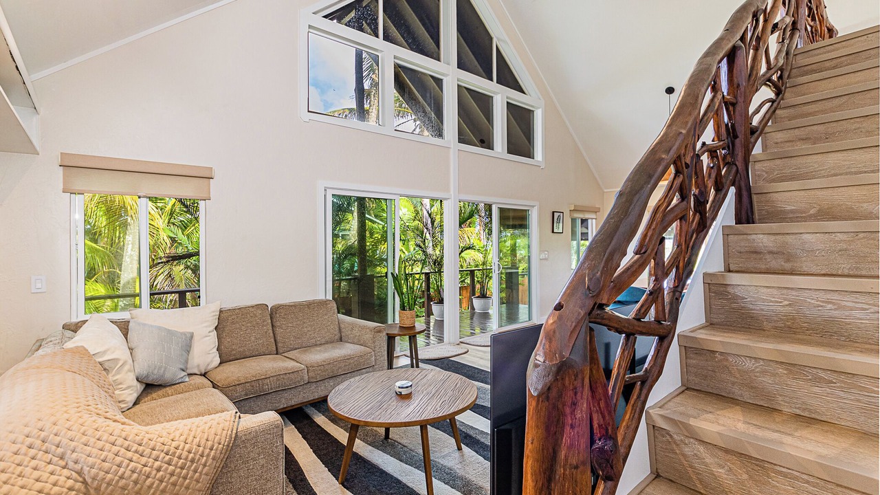 Zuki House occupancy is 5 guests. We have three bedrooms, one with a king bed, one with a queen bed, and one with a full bed. There are two full bathrooms. One bedroom and bathroom is upstairs in the loft with a balcony lanai with ocean views. On the main floor are the other two bedrooms, full bathroom, kitchen, dining area, living room and covered wrap around lanai. Enjoy the ocean sound and breezes from the outside. The yard is nicely manicured and our hot tub is perfect for star gazing at night. There's a nice outdoor shower too.